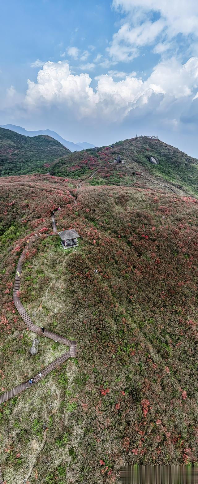 从空中望去连绵的绯红撞入眼帘,满山遍野的映山红,以一种磅礴的姿态在山脊线上肆意绽放。它们像是被打翻了的胭脂盒,泼洒在起伏的苍翠之间。