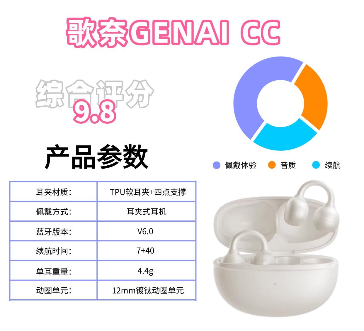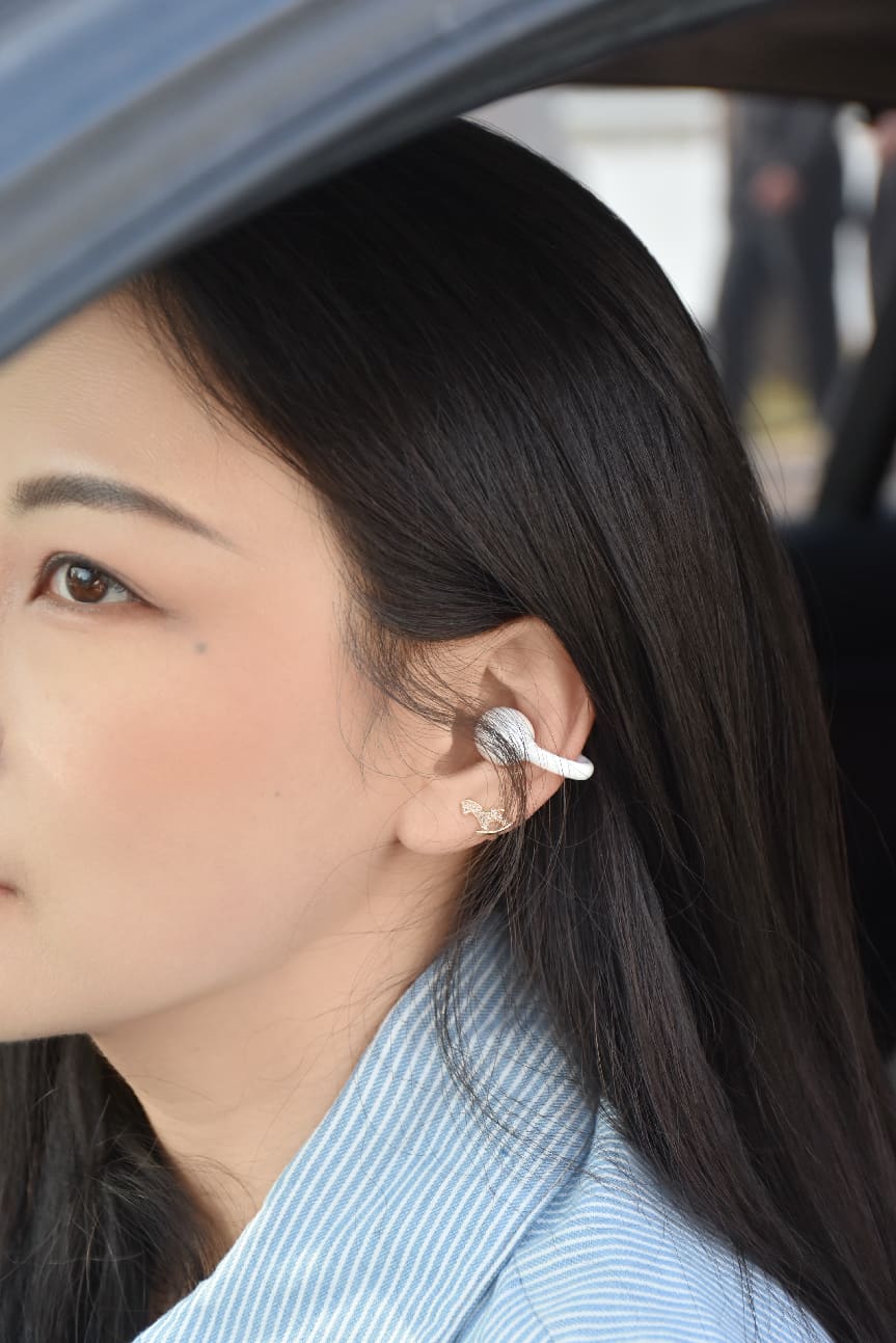 单耳克重约4.4g,是比一元硬币还轻,戴上几乎没存在感,TPU复合材质C形桥经过3000次弯折测试,恢复力99.2%,3D弧形工学设计下能完美的贴合耳廓,压力均匀分散,连续戴3小时也完全不会有胀痛、不泛红。夹力适中不松垮,跑步和跳跃都稳固不掉,眼镜党戴也不卡镜腿,IPX5防水可以应对暴汗或者全场景佩戴下是无压力的。