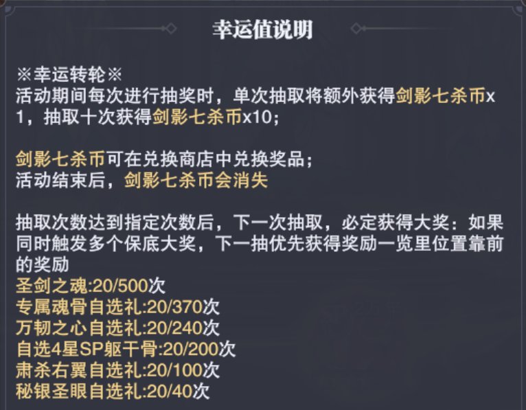 1、666x2x3=60张七杀券2、30Rx1=6张七杀券3、68Rx1=10张七杀券4、每日累充满30R送x1=2张七杀券5、累抽85次送=8张七杀券6、88钻石x10=10张七杀券(30R和68R礼包买完出现)共计96张七杀券,120抽,花费=98R+4876钻石顺手拿到4个器源,差萧杀左翼和万仞之心。