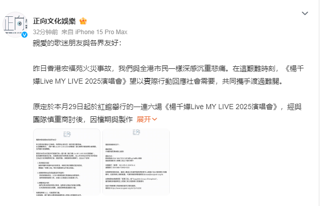 就在灾后不到24小时,11月27日,著名歌手杨千嬅所属经纪公司“正向文化娱乐”发布公告,对原定于29日起在红馆举行的一连六场《杨千嬅Live MY LIVE 2025演唱会》作出多项调整。