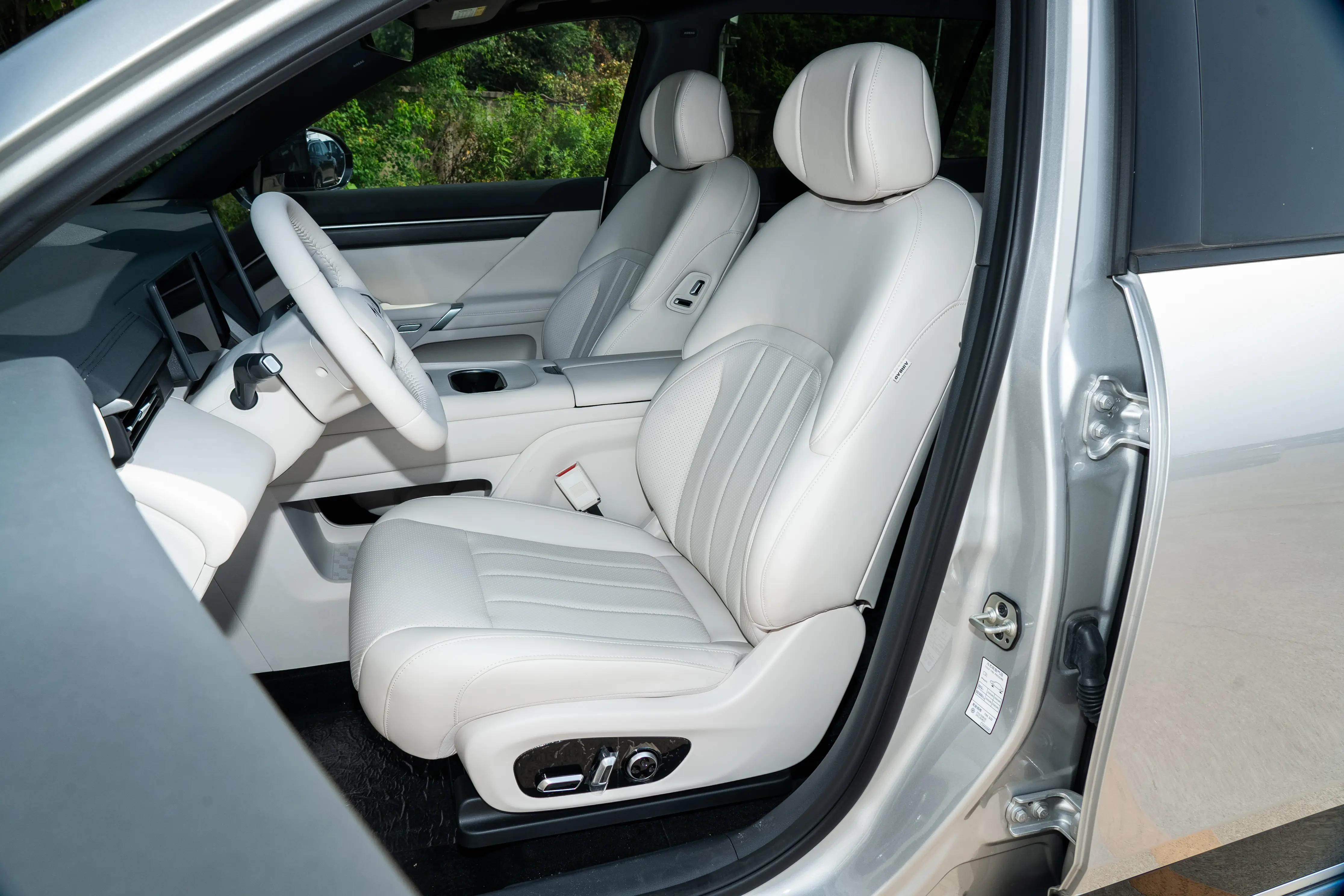 细节设计处处贴心:皮质包裹的多功能方向盘,造型美观时尚,支持上下前后四向调节和加热功能,握感舒适;电子怀挡设计,既节约空间,操作也非常方便;前排配备了50W无线充电面板和2个USB/Type-C的多媒体接口,满足多台电子设备的充电需求;电释放内门把手采用按键开启设计,轻触即开,操作方便;主副驾标配LED柔光美妆镜,光线柔和不刺眼;64色氛围灯支持10级亮度调节,搭配多种特定灯语,能营造出不同的出行氛围。