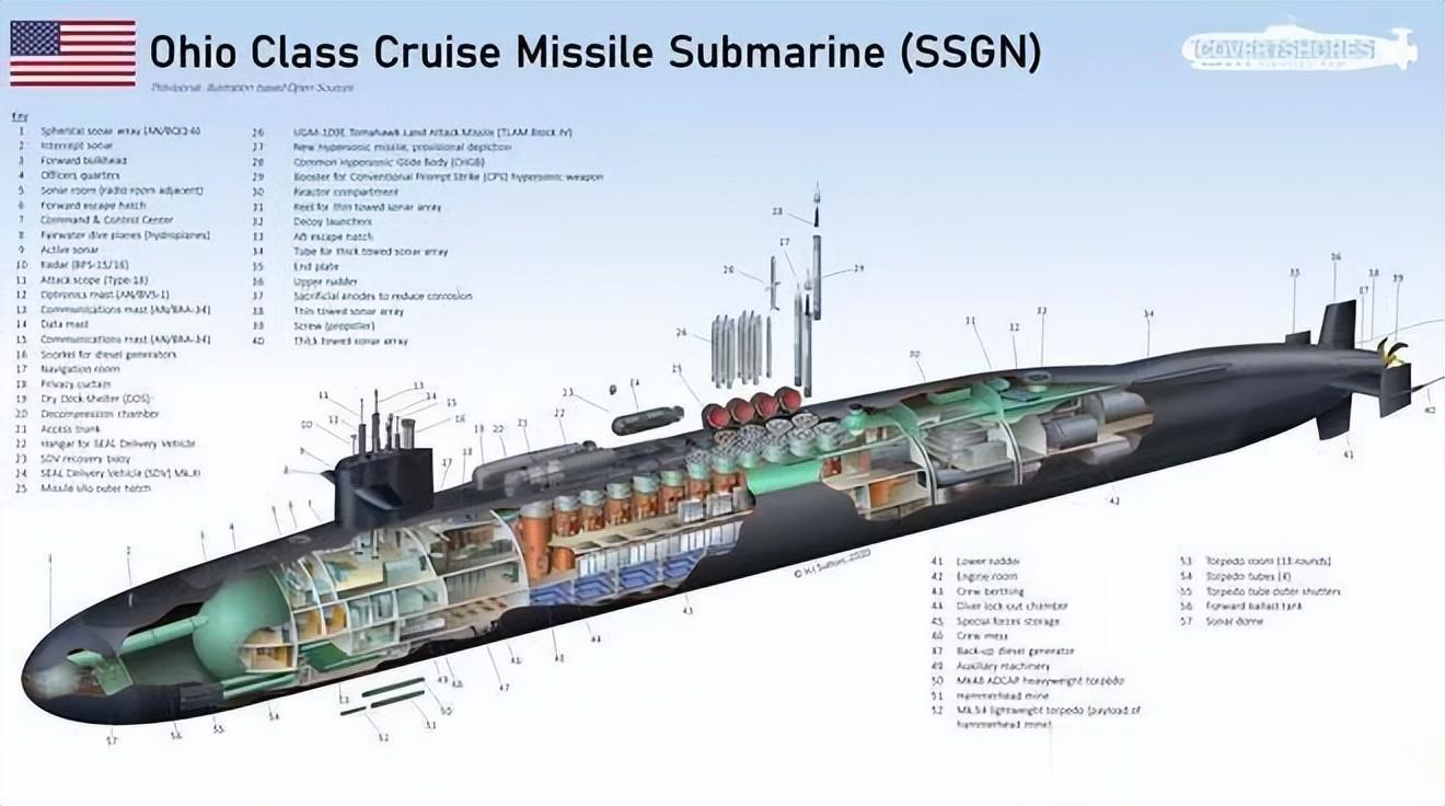 在威慑效能上,它摒弃了俄亥俄级“堆数量”的思路,以精准与适配实现效能升级。哥伦比亚级的导弹发射管从24具缩减至16具,但采用4个通用导弹舱模块化设计,不仅兼容现役三叉戟II-D5LE延寿型导弹(射程超1.2万公里,圆概率偏差进一步缩小),还预留了下一代潜射导弹的升级空间。结合美俄核裁军条约的弹头数量限制,16具发射管的配置既符合国际协议,又能通过高精度弹头实现同等甚至更强的威慑效果,避免了俄亥俄级部分发射管闲置的资源浪费。同时,艇上还配备8具鱼雷发射管,可搭载MK-48重型鱼雷与战斧巡航导弹,未来还能集成高超音速武器与无人水下航行器,实现战略核打击与战术常规攻击的双向覆盖。