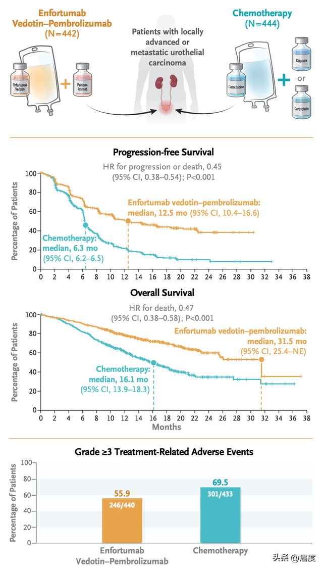 恩诺单抗(英文:enfortumab vedotin)是一种抗体偶联药,该药与PD-1抑制剂帕博利珠单抗联合使用,对于之前接受过治疗的局部晚期和转移性尿路上皮癌有效果,临床前的研究显示这两个药物组合能增强抗肿瘤活性、表现出持久的抗肿瘤免疫力。恩诺单抗和帕博利珠单抗联合治疗不适合含顺铂化疗的尿路上皮癌患者,下面则是这两个药在没有经过铂类的尿路上皮癌的疗效,也就是药物在一线治疗的疗效情况,研究成果是刊登在国际著名学术期刊《新英格兰医学》。