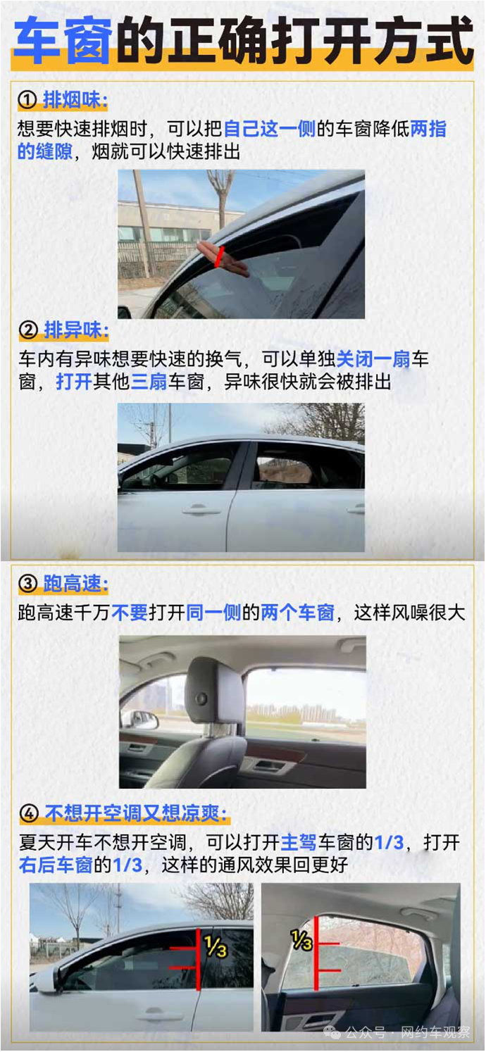 在天气条件允许的情况下,可以将左后车窗和右前车窗各留一条小缝。这样的开窗组合能在车内形成空气对流,促进微循环,既不产生过大风噪,又能让新鲜空气持续流入。尤其遇到抽烟、饮酒或使用浓郁香水的乘客后,这种微循环能有效防止气味滞留。