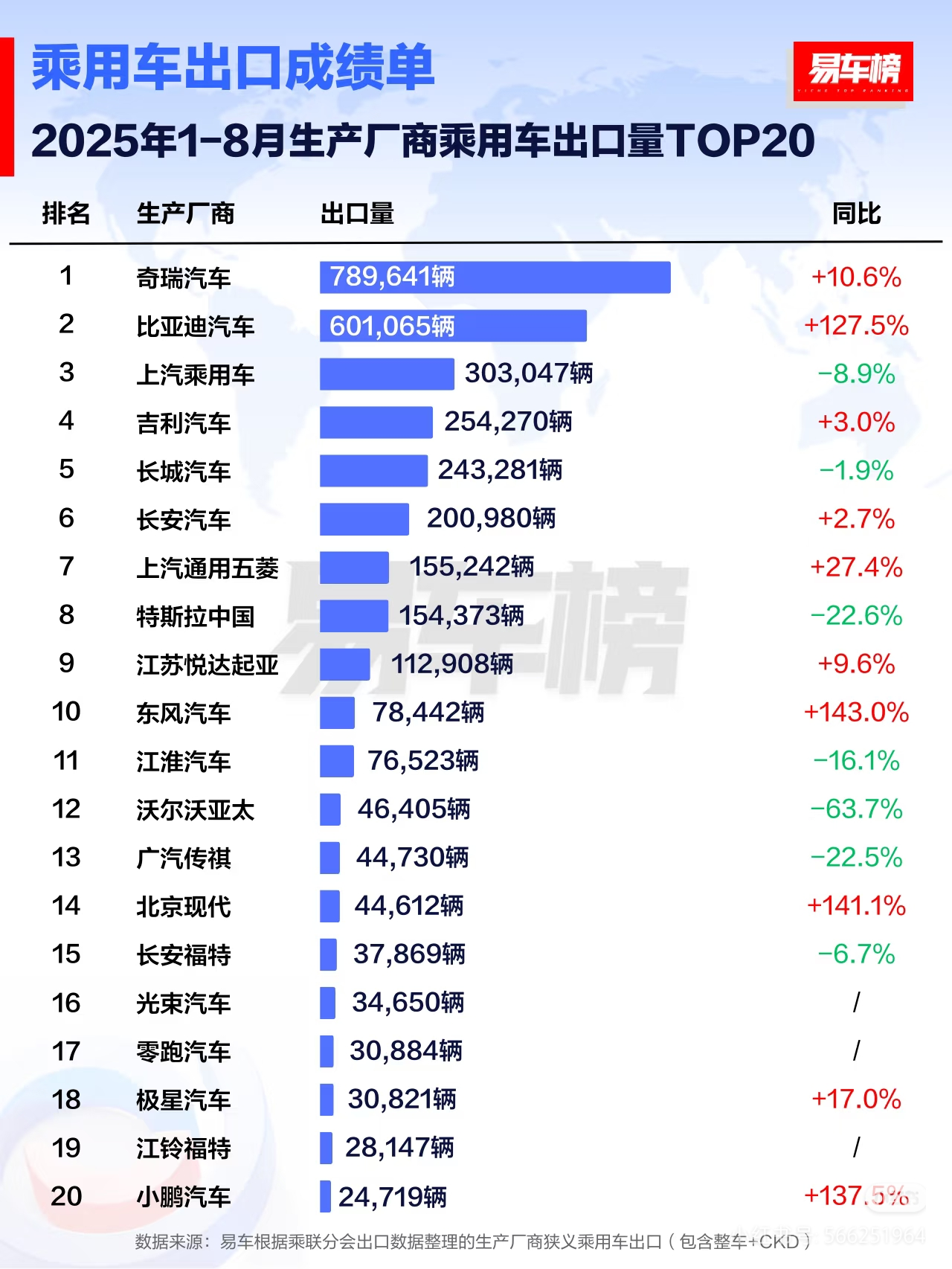 比亚迪出海再秀亮眼成绩,8月交出一份令人惊叹的成绩单!根据最新出口数据,比亚迪在8月的乘用车出口量达到了79,603辆,同比增长了惊人的154.5%,这一增速让比亚迪稳居中国品牌出海的领先地位。更值得一提的是,年初至今,比亚迪的累计出口量已突破60万辆,成功挑战了全球汽车市场的竞争格局。明星车型宋PLUS新能源表现尤为突出,成为了比亚迪在出口市场的“新宠”,稳居车型出口榜榜首。