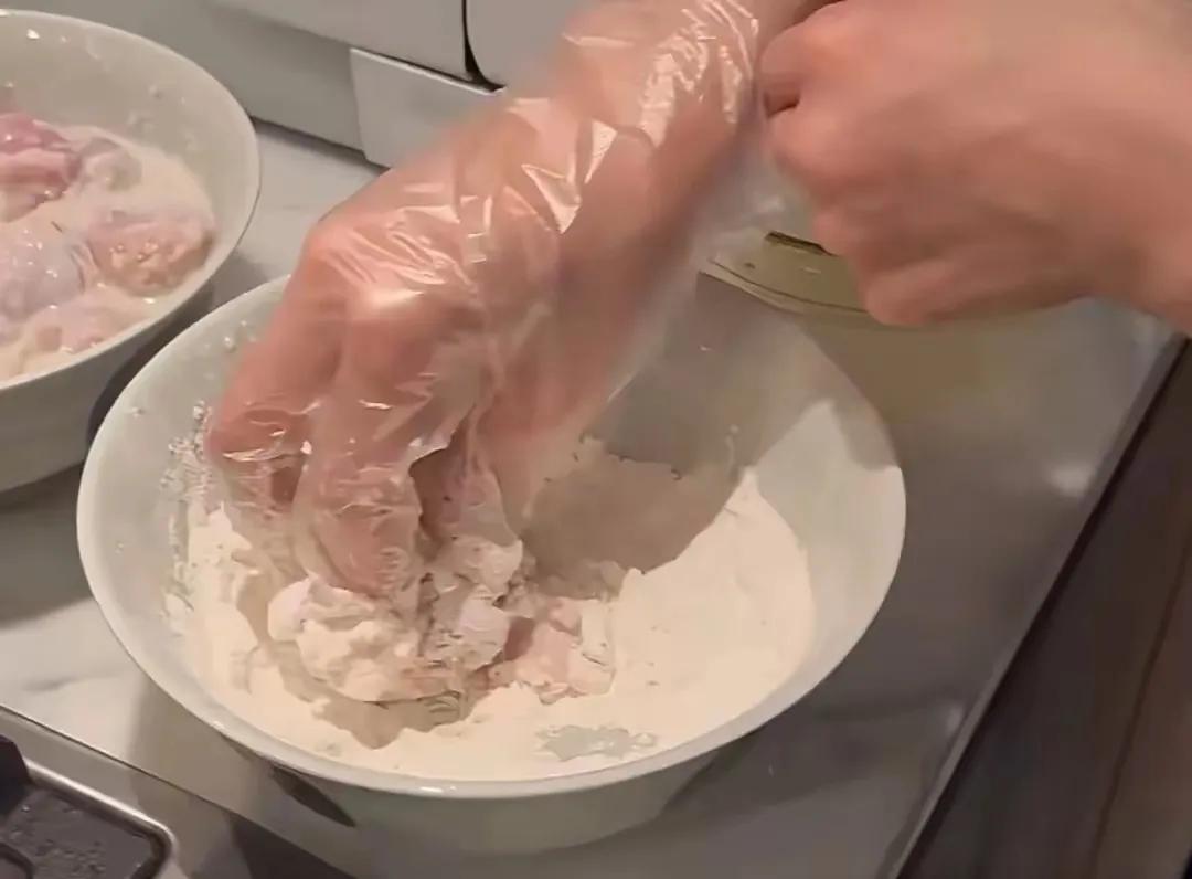裹粉是炸鸡块制作中很关键的一步。董洁说:“裹粉时要均匀,不能有太多的干粉沾在鸡肉上。过一下水再裹一层粉,能让炸粉更好地沾在鸡肉上,炸出来的鸡块更酥脆。”