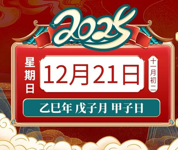 2025年12月21日,星期日,农历十一月初二 (乙巳年戊子月甲子日),法定节假日。