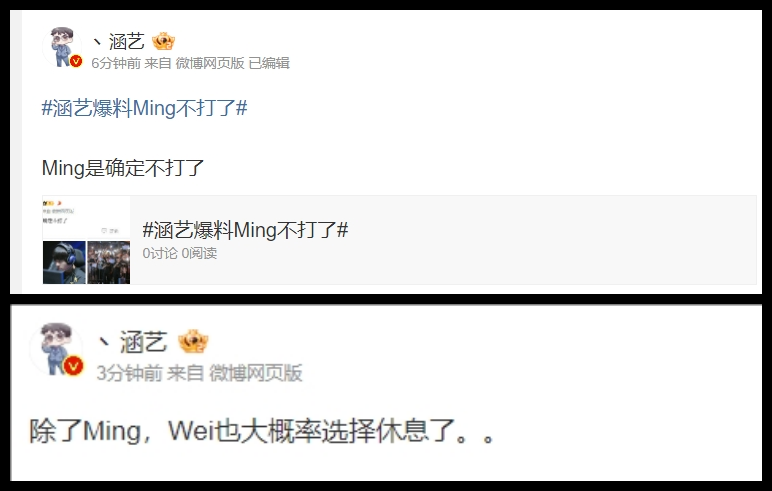 最后还有一个小道消息跟大家分享一下,根据圈内人的最新爆料,RNG的野辅,也就是ming和wei都要选择休息了,这个消息的真假目前难辨,毕竟爆料的这人跟wei还在打官司呢,但至少我们能看出一点,RNG这个队伍,现在真的是内忧外患。
