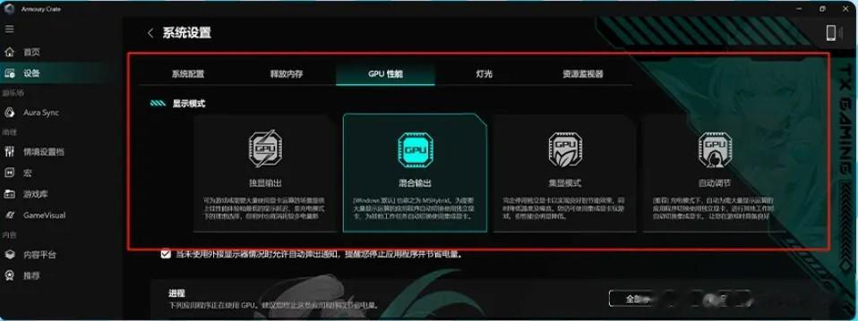 以华硕天选6 Pro为例,打开内置的奥创智控中心,可以直接选择独显输出模式。或者在NVIDIA控制面板里,也能找到相关设置。切换后,画面由独立显卡直接输出,性能才能被充分释放,帧数也能稳定下来。