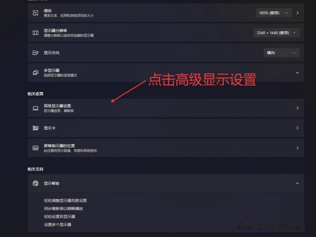 桌面右键选择显示设置,往下拉找到高级显示设置。