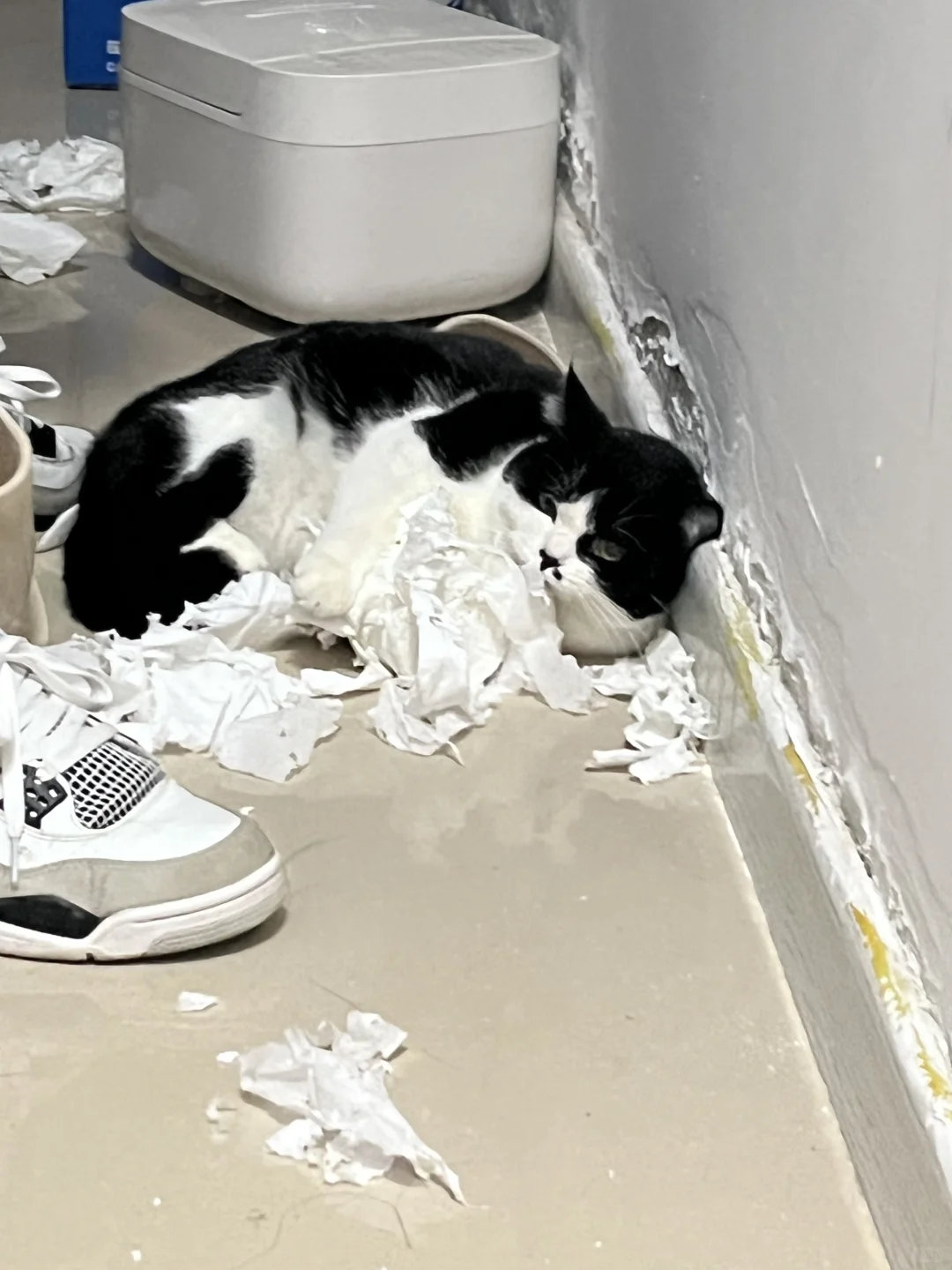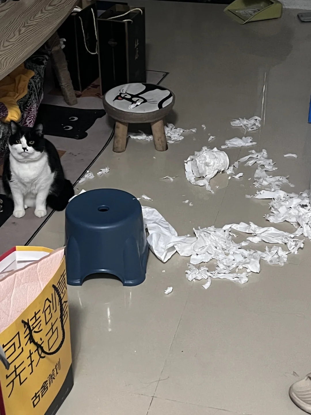 我家奶牛猫把卫生纸撕成这样!满地纸屑还一脸无辜,刚才摸它的时候还乖乖的,这会就开始疯狂造作…养宠人谁懂啊?你家毛孩子拆家也是这么离谱吗?