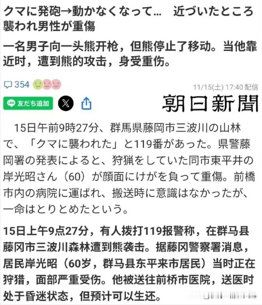 据朝日新闻报道称,11月15日,在群马县六名日本人围猎黑熊,猎枪射击后熊倒地装死,待人靠近后突然发动袭击,造成一人重伤后成功逃逸。 看完这则新闻,要不就是熊熊聪明,要不就是日本人笨。日本的熊熊现在饿急眼了都开始吃上日本人了。 谁能想到,野生动物也有这般 “反杀” 智慧!朝日新闻报道的一则消息让人哭笑不得,11 月 15 日,日本群马县发生一起黑熊伤人事件。 六名日本人组队围猎黑熊,猎枪击中目标后看着黑熊倒地不动,以为狩猎成功,没料到这竟是黑熊的 “缓兵之计”,待人靠近时突然发动袭击,造成一人重伤后成功逃逸。 这起围猎事件的过程充满了戏剧性。当天,六名狩猎爱好者携带猎枪前往群马县的山林区域,目标就是当地频繁出没的黑熊。 近年来,日本山林地区的黑熊与人类冲突逐渐增多,群马县更是黑熊活动的高发区域,当地允许在规定季节进行合法围猎,以控制黑熊数量、减少对居民生活的影响。六人按照围猎的常规流程,分工协作搜寻黑熊踪迹,经过数小时排查,终于在一片密林边缘发现了目标。 发现黑熊后,其中一名经验丰富的猎人迅速瞄准射击,猎枪子弹精准命中黑熊躯干,黑熊应声倒地,趴在地上一动不动,看起来已经失去了生命体征。 六人见状十分兴奋,认为狩猎任务圆满完成,纷纷靠近查看情况,准备将黑熊抬走。就在最前面一人距离黑熊不足两米时,原本倒地 “装死” 的黑熊突然猛地起身,挥舞着利爪扑了过去,速度之快让众人猝不及防。 毫无防备的猎人被黑熊狠狠扑倒在地,背部和腿部遭到重创,鲜血瞬间浸透了衣物。其余五人被这突如其来的变故吓懵,反应过来后急忙拿起猎枪想要再次射击,但黑熊袭击后并未恋战,趁着众人慌乱之际,迅速钻进旁边的密林深处,消失得无影无踪。 受伤猎人的伤势较重,同伴们立即拨打了急救电话,随后伤者被紧急送往附近医院救治,目前仍在接受进一步治疗,暂无生命危险。 这起事件很快在日本引发热议,不少网友对黑熊的 “聪明” 感到惊讶,没想到野生动物竟能想出 “装死诱敌” 的策略。据日本野生动物专家介绍,黑熊虽然看似笨拙,但其实智商不低,在遭遇危险时会采取多种自保方式,装死就是其中一种常见手段。 当黑熊受到枪击等伤害后,若未致命,可能会通过静止不动的方式降低敌人的警惕心,等待合适的时机逃生,这次群马县的黑熊就是利用了这一本能,成功摆脱了围猎。 此次六名围猎者显然过于心急,没有遵守安全流程,最终导致意外发生。近年来,日本类似的野生动物伤人事件时有发生,仅群马县今年就已报告十余起黑熊闯入居民区、袭击人类的案例。 日本环境省的数据显示,近五年内,日本全国的野生动物伤人事件数量呈现逐年上升趋势,其中黑熊造成的伤害占比超过三成。 此次群马县的黑熊袭击事件,不仅给围猎者敲响了安全警钟,也让更多人关注到人与自然和谐共处的问题。合法围猎虽然是控制野生动物数量的一种方式,但必须严格遵守操作规范,保障自身安全。 同时,如何平衡人类活动与野生动物的生存空间,减少此类冲突的发生,也成为日本相关部门需要思考的问题。 对此,你们有什么看法,欢迎评论留言~
