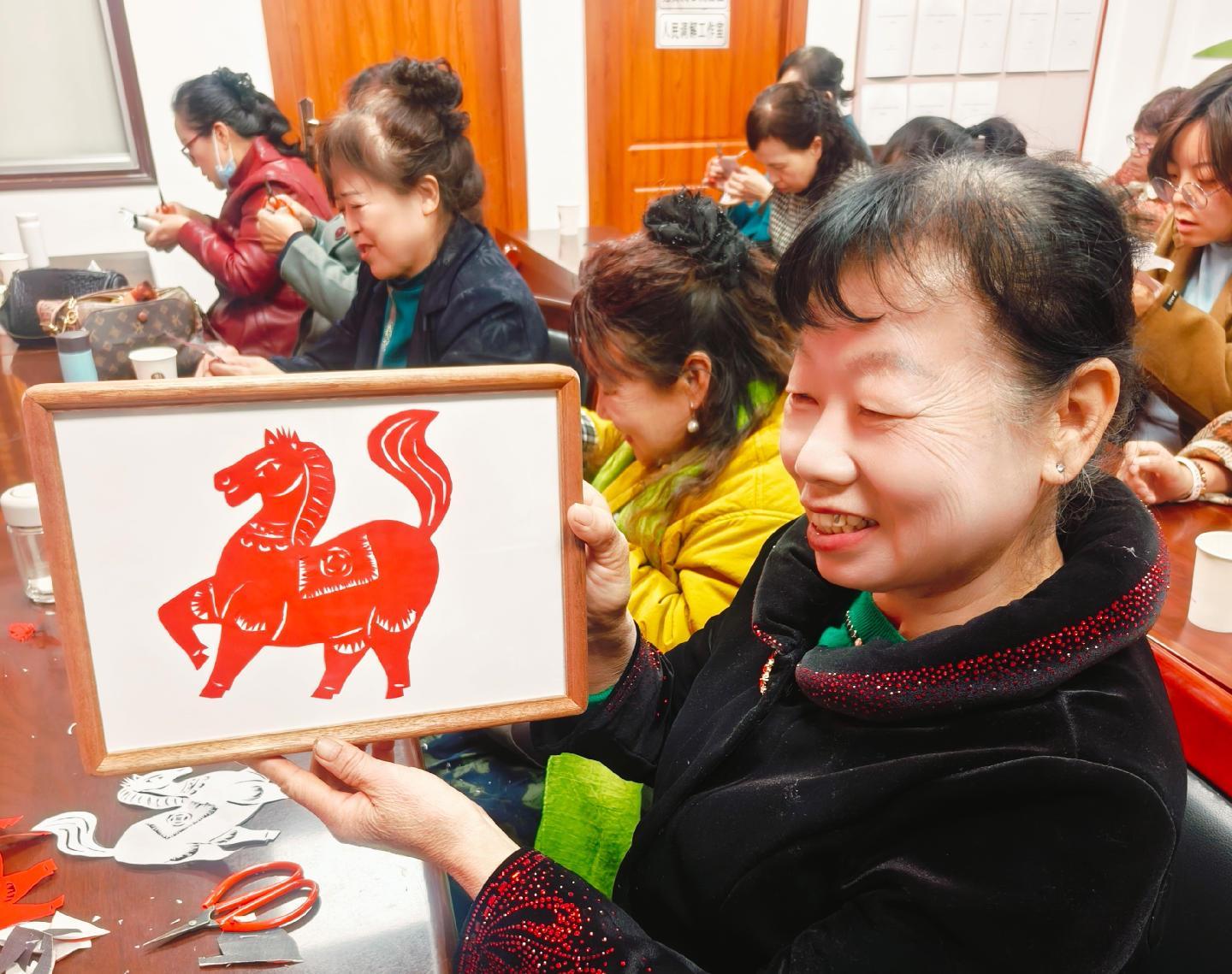 活动中,剪纸老师采用“分步示范+一对一指导”模式,从基础折纸技巧讲起,逐步讲授对称剪、阴刻、阳刻等核心技法。老人们手持红纸与剪刀,全神贯注地跟随老师学习:有的反复练习“团花”折法,有的专注雕刻“骏马”图案,社区志愿者穿梭其间,为手部灵活度较低的老人提供辅助,现场氛围温馨而热烈。