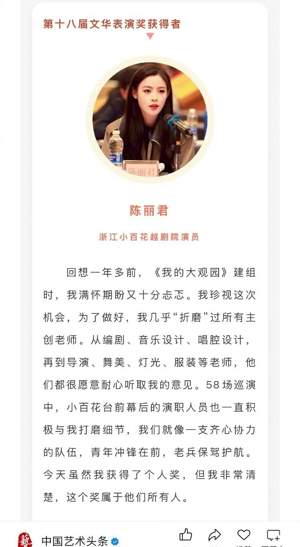 陈丽君亮相第十八届文华奖获奖单位和代表座谈会并发言,优秀的君君用实力绽放光芒 未