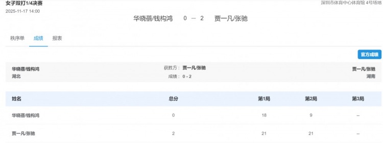 羽毛球女双1/4决赛,湖南队贾一凡/张驰2-0战胜湖北队华晓蓓/钱构鸿,福建队黄东萍/谭宁2-0战胜广东队陈笑菲/冯雪颖,广东队李怡婧/罗徐敏2-0战胜湖北队杜玥/李汶妹,四川队郑雨/张殊贤2-0战胜辽宁队郑煜文/刘圣书。