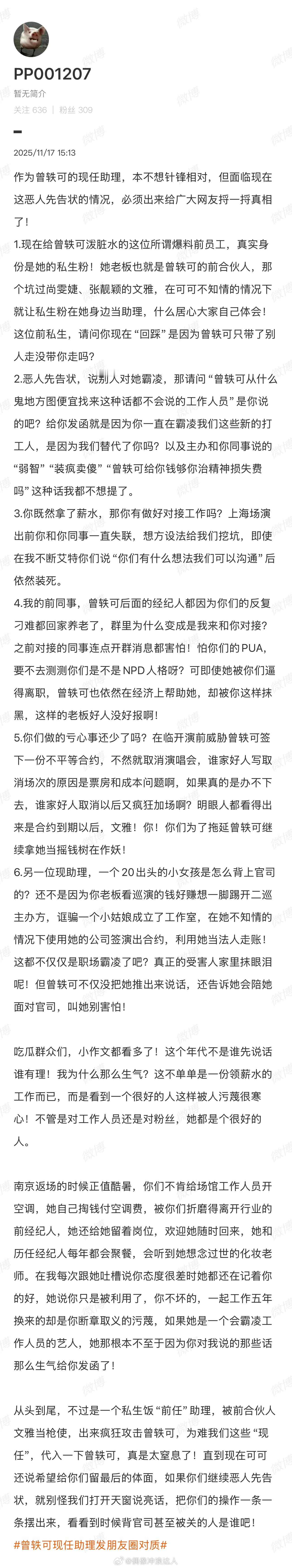 歌手曾轶可前工作人员发长文喊话曾轶可要求道歉:在我跟你共事和合作期间,你多次情绪