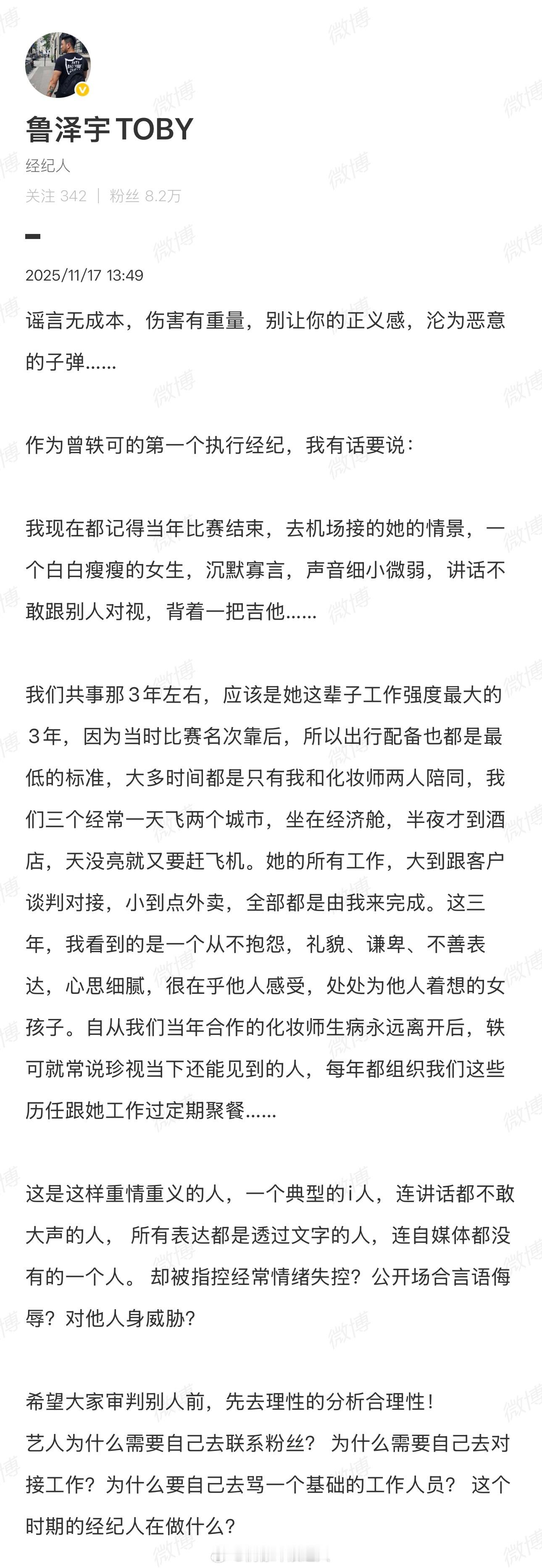 曾轶可现在的助理以及曾经合作过的经纪人,都发文为曾轶可发声,力挺曾轶可!