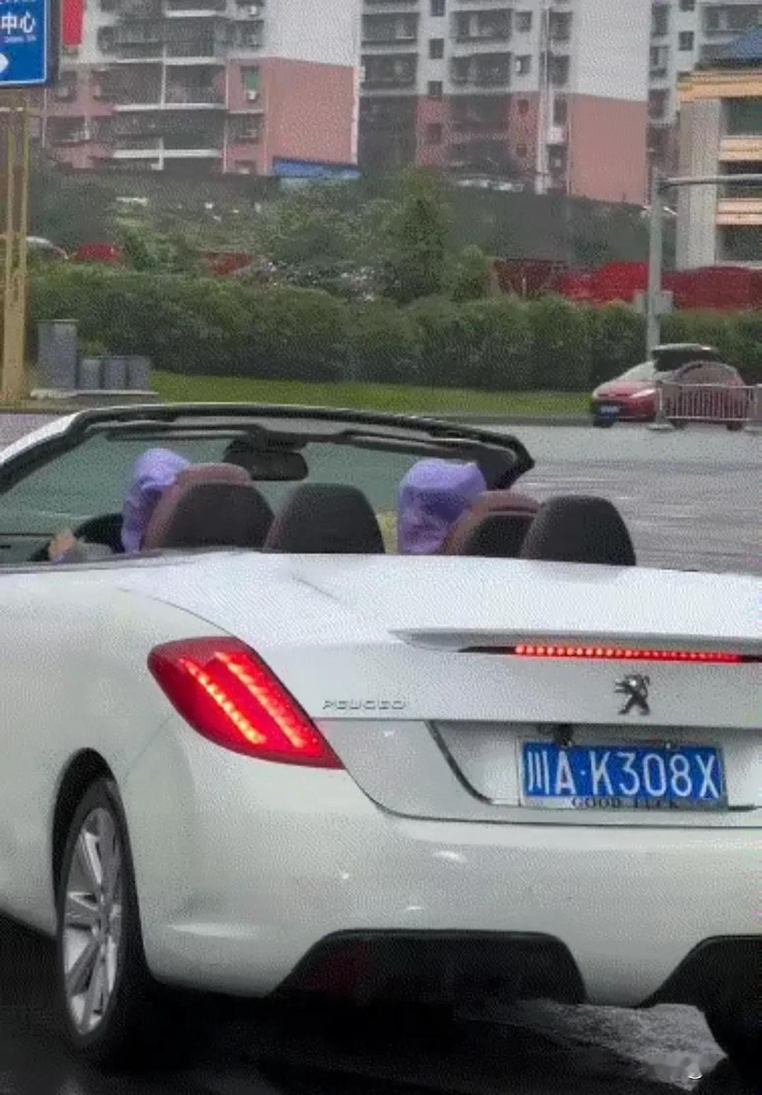 说实话开这敞篷跑车上街不尴尬吗?全新车都才30多万,二手车几万块,性能弱得一塌糊涂,内部空间小得捉襟见肘,外观丑得稀里糊涂,顶棚坏得时机成熟,正刚刚下雨就坏了,让两人狼狈不堪,只能穿着雨衣驾驶。 标志308CC敞篷跑车