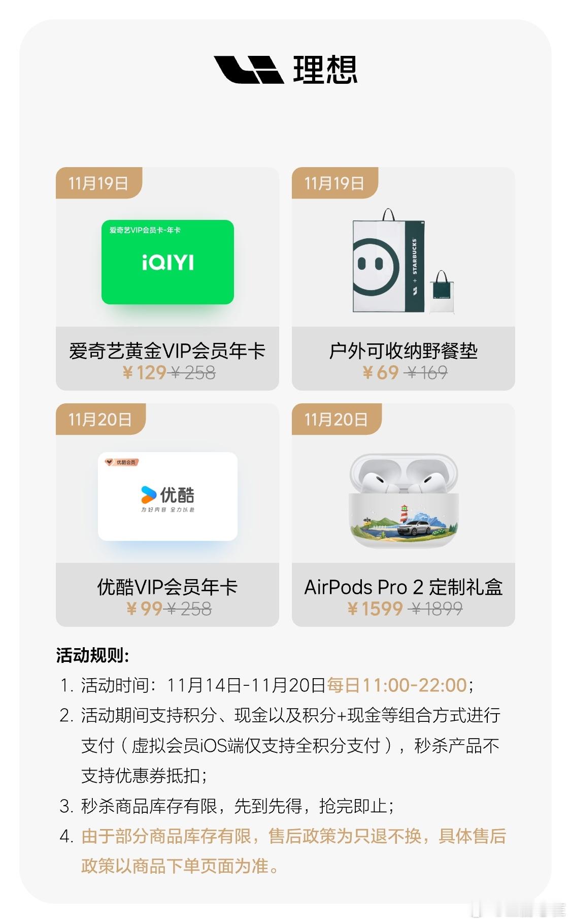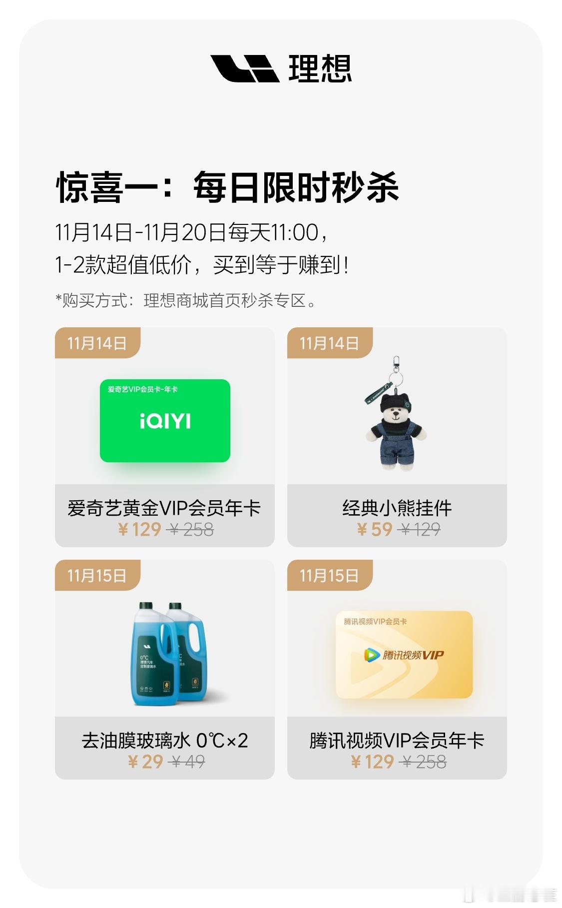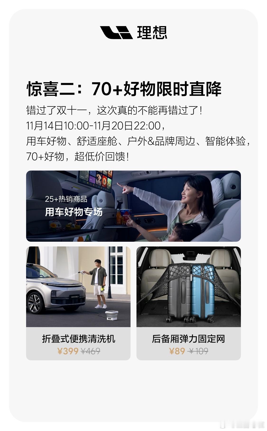 来薅 的羊毛吧,11月14日10点-11月20日22点,庆祝,商城的70多款好物限时大降价,还有秒杀活动什么的,车友们不要错过。