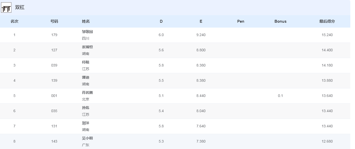 虎扑11月17日讯刚刚结束的全运会体操男子双杠决赛,四川队的邹敬园15.240分轻松夺冠。