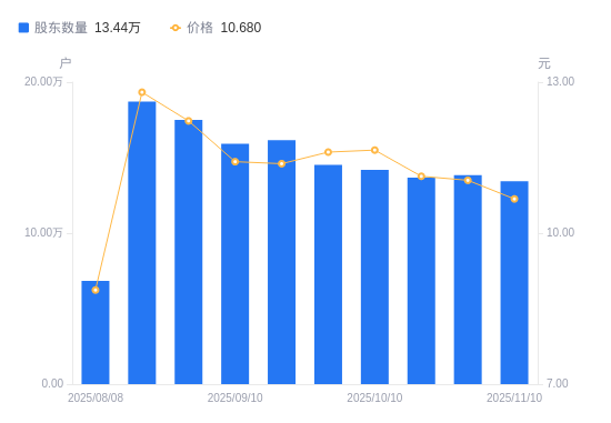 日期A股户数(户)流通A股户均持股数(股)户均持股市值(万元)2025-11-1013439726806.1028.632025-10-3113833426043.2028.782025-10-2013682926329.6529.302025-10-1014192025385.1429.572025-09-3014529224795.9928.792025-09-1916149622308.0425.392025-09-1015918622631.7625.852025-08-2917508320576.8725.172025-08-2018714118636.3423.852025-08-086844450955.8645.20