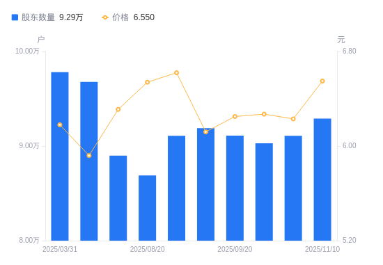 日期A股户数(户)流通A股户均持股数(股)户均持股市值(万元)2025-11-109291318982.5212.432025-10-209108519363.4812.062025-09-309029519532.9012.252025-09-209110419304.9012.072025-09-109189219139.3511.712025-08-319107919310.1912.782025-08-208689320240.4513.242025-08-108899419762.6012.472025-06-309677618173.4410.762025-03-319781117496.6910.81