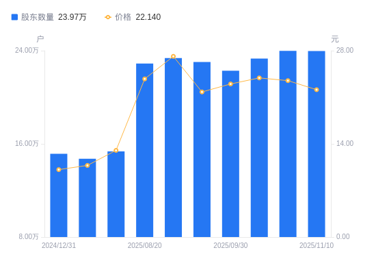 近一年(2024年12月31日至2025年11月10日),盛和资源A股股东户数从15.15万户,增加至23.97万户,增幅58.26%,区间股价上涨110.66%。