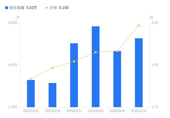 日期A股户数(户)流通A股户均持股数(股)户均持股市值(万元)2025-11-105018817884.8511.072025-09-304532619803.3110.102025-06-305471316405.708.282025-03-314827518593.588.652025-02-283318627047.7011.852024-12-313433626141.8010.252024-09-303165528355.8610.522024-06-303015729764.3910.112024-03-313175528266.5711.042023-12-313008529835.6311.53