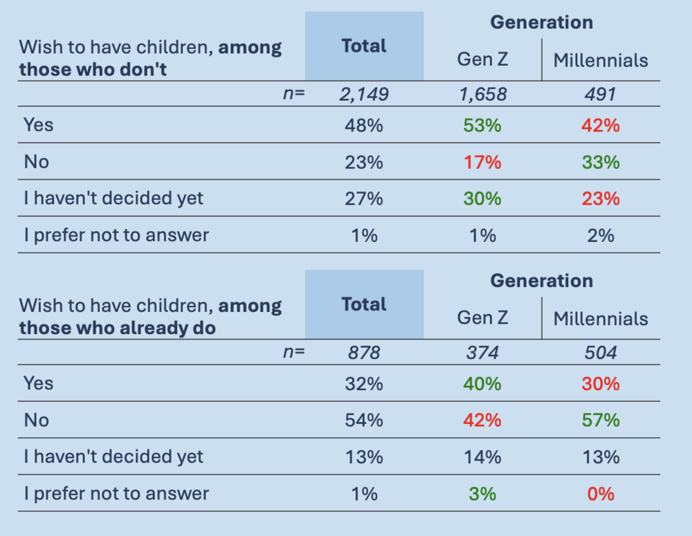 比如,在一份Leger发布的Z世代报告中,数据显示在这个群体没有孩子的人当中,仍有53%表示未来希望生育子女,这个数字也超过了千禧一代(42%)。