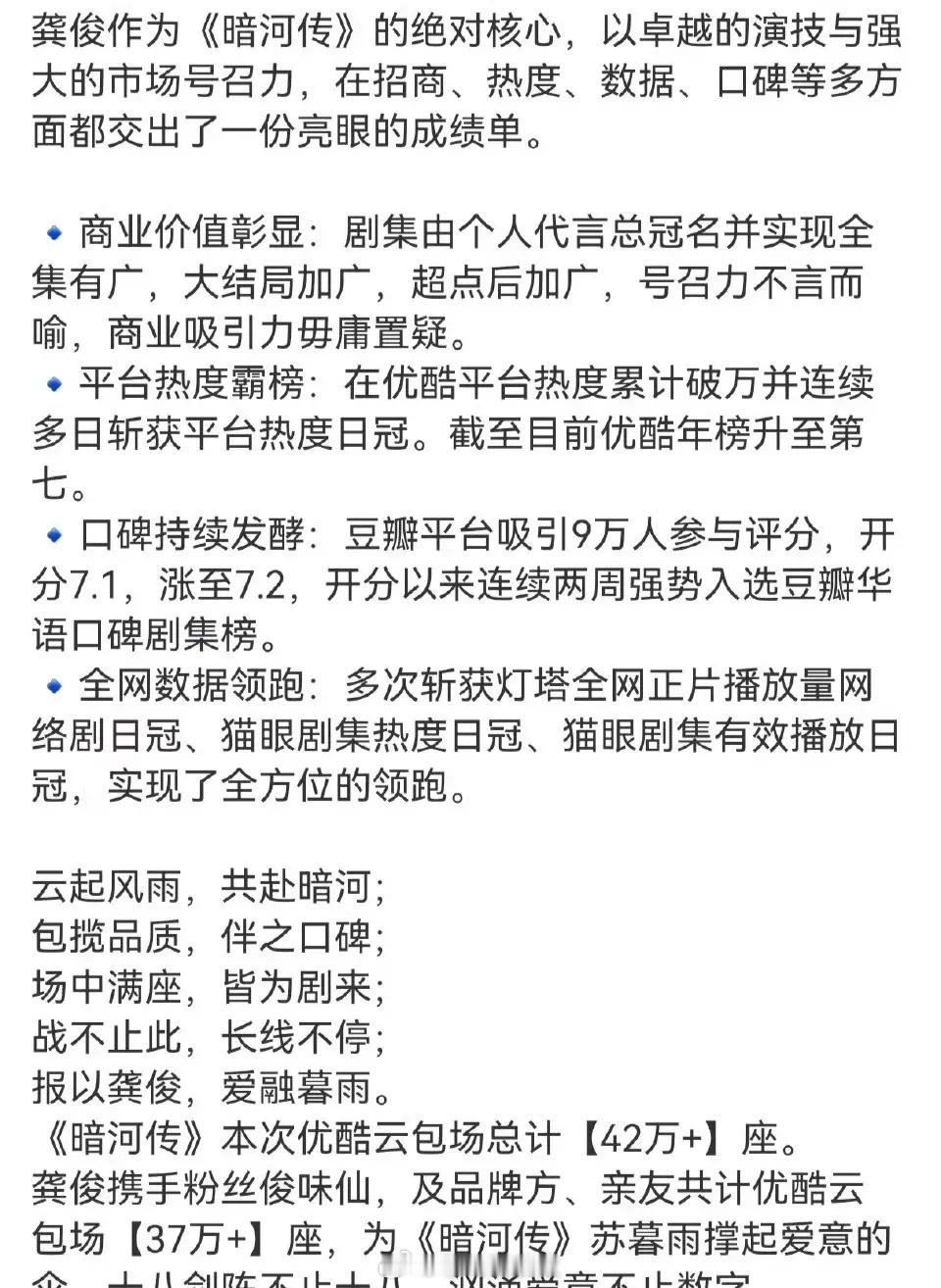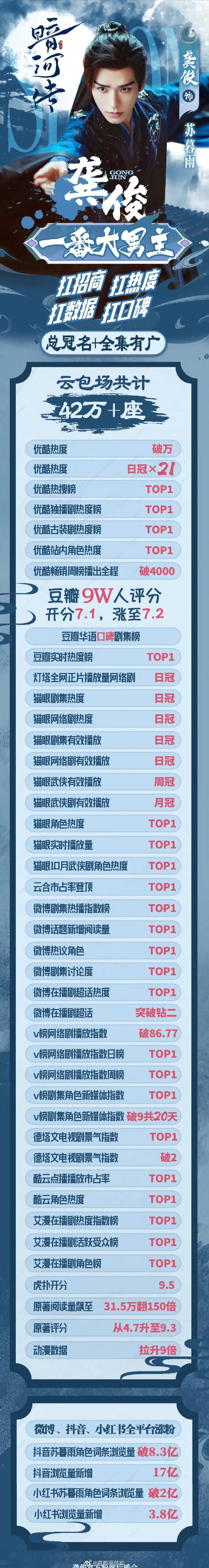 龚俊一番大男主剧《暗河传》战报总云包场42w+爆梗苏暮雨“三不接”db开分7.1,如今7.2优酷站内热度破万,拉新年榜第七自身代言为总冠+全集投广,全集有广虎扑开分9.5,男频大男主剧开分最高灯塔、猫眼、云合、酷云、v榜、德塔文以及微博各榜单登顶TOP1,艾漫活跃受众史一
