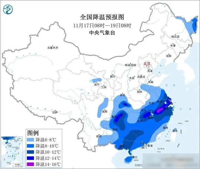 中央气象台11月17日6时继续发布寒潮蓝色预警——