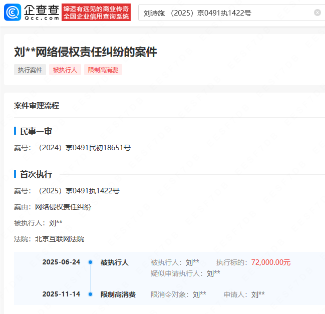 企查查APP显示,近日,刘诗施(刘诗诗)起诉刘某某网络侵权责任纠纷一案更新,被告刘某某因未按期履行给付义务被法院签发限制消费令。此前,刘某某已被强制执行7.2万元。