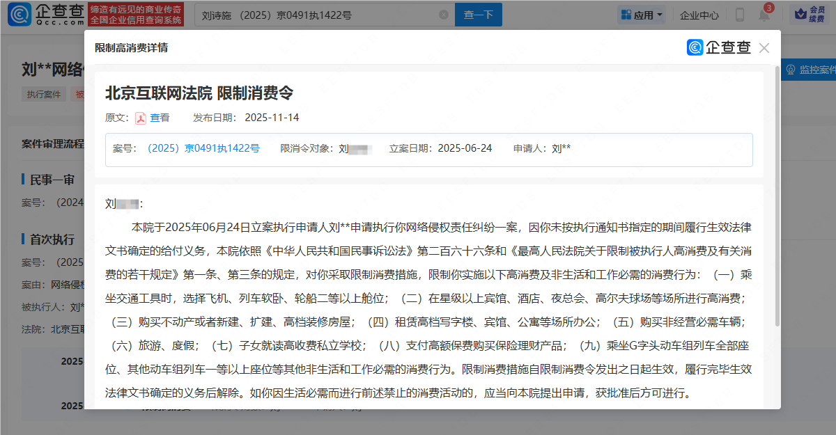 刘诗诗黑粉被签发限制消费令