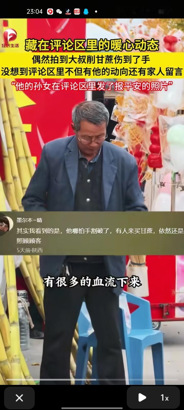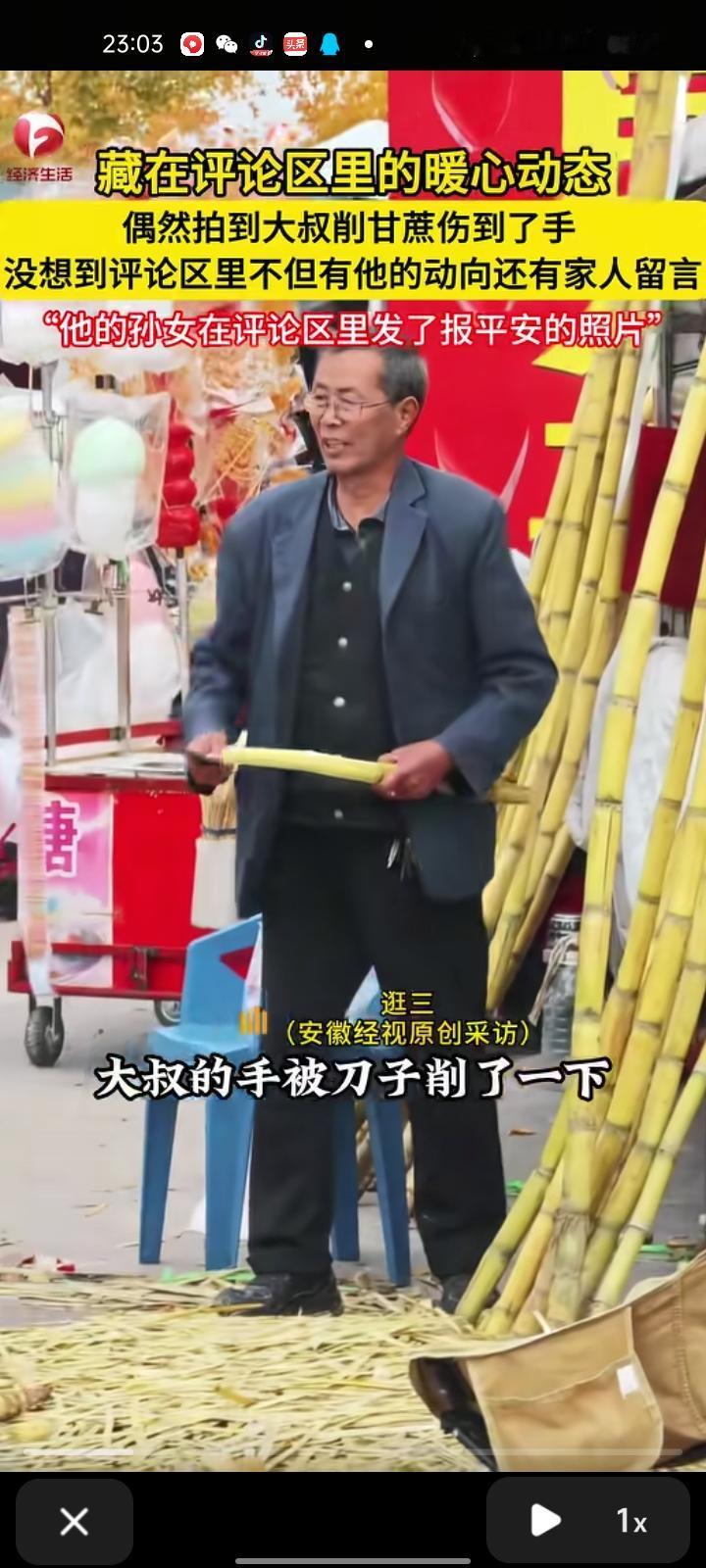 11月11日,宝鸡市岐山县。网友随手拍摄大叔削甘蔗伤到手,鲜血直流,没想到评论区不但有他的动向还向家人留言,其中孙女发了报平安的照片,看到她爷爷的手已经愈合了。