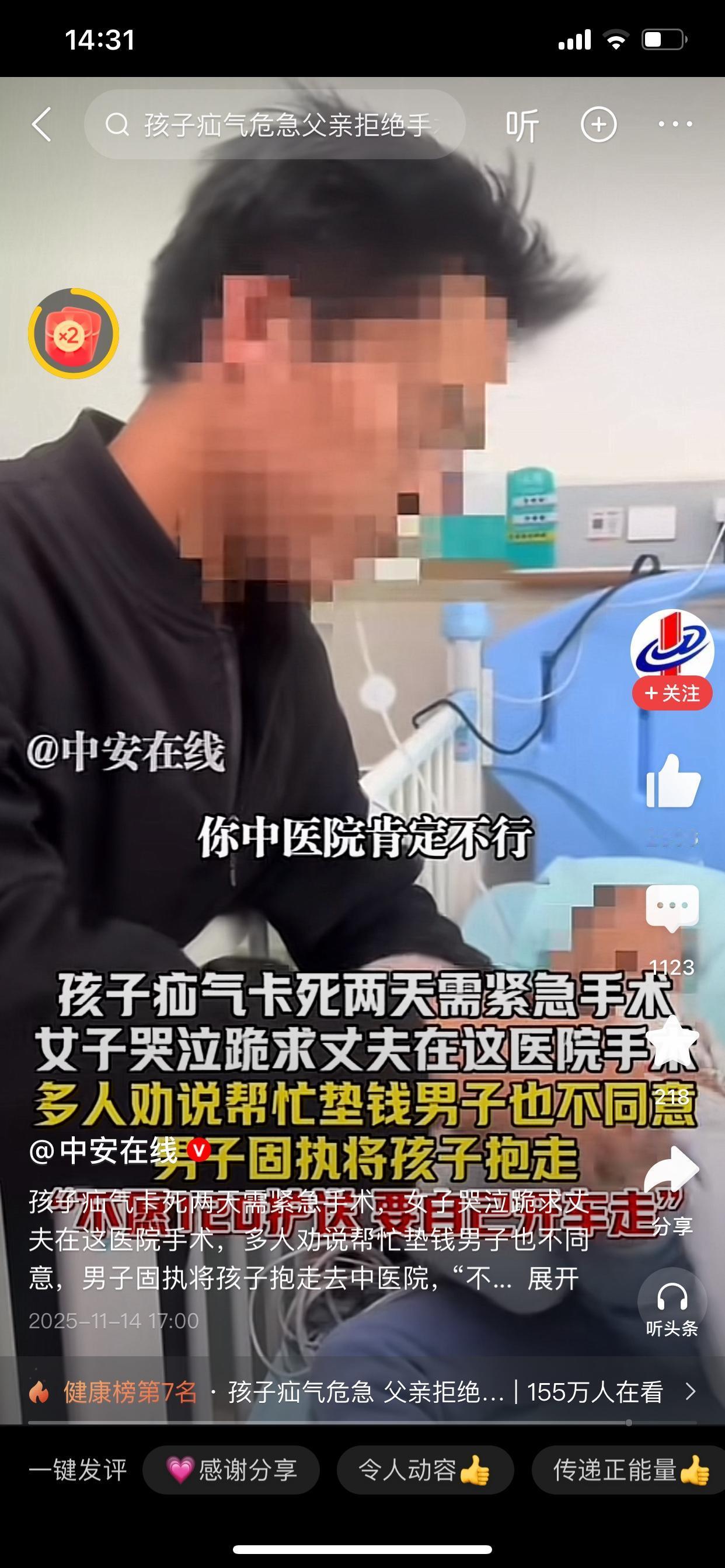 这个父亲一听说要给孩子做手术,立马就不干了,拼了命的也要把孩子带走,你说他没钱吧,旁边有人说我可以帮你付,但是他不接受, 他看着孩子发紫的嘴唇,冒着巨大的风险拿掉氧气罩也要带走孩子,孩子的母亲跪下来也阻止不了… 评论区一堆人说他不负责任,可是你看他那拼命的样子,哪里是不负责,他是不想让孩子进手术室,他怕………