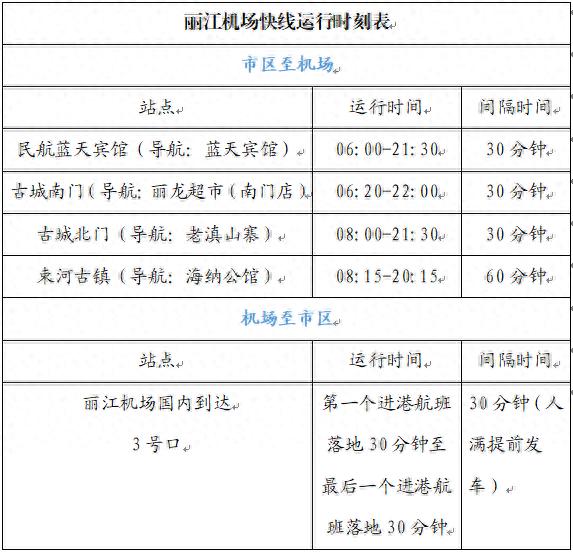 注:丽江市区(民航蓝天宾馆)→丽江机场末班车时间由22:00调整至21:30。