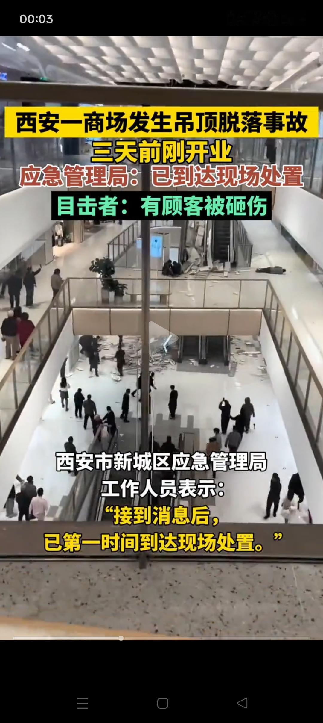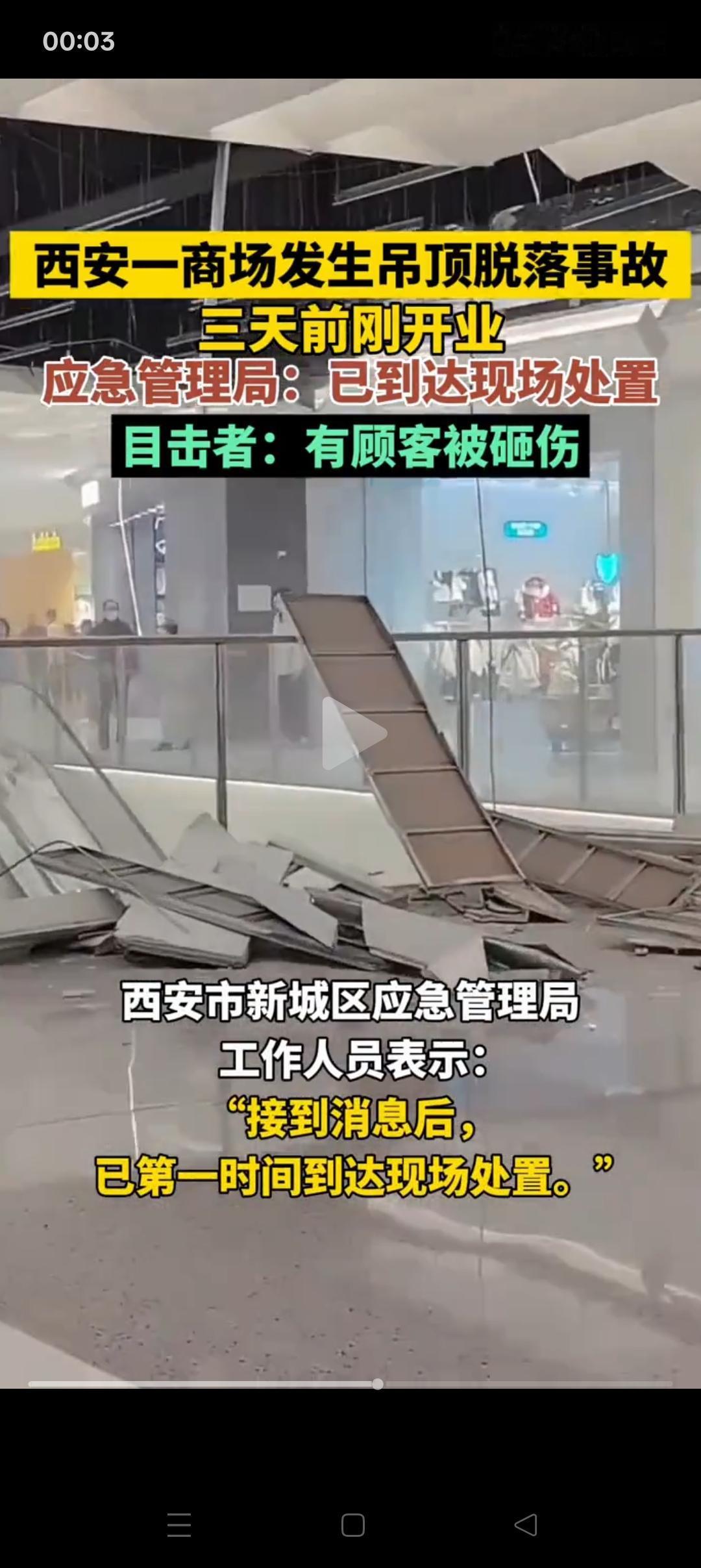 西安一商场吊顶脱落,多人受伤! 给所有工程人都提了个醒! 那就是不管工期多紧,催的多急,都一定要把质量放在第一位,按部就班的施工。 千万不要为了赶进度就省略一些步骤,虽然可以及时交付,但也会给将来带来很大的隐患 作为工程人,曾经也多次遇到催工期的时候,我都会一一解释,实在不理解,就让对方换人做,坚守底线。 这商场开业才几天,吊顶就掉下来了,作为工程人,看了挺心痛的,一言难尽。。