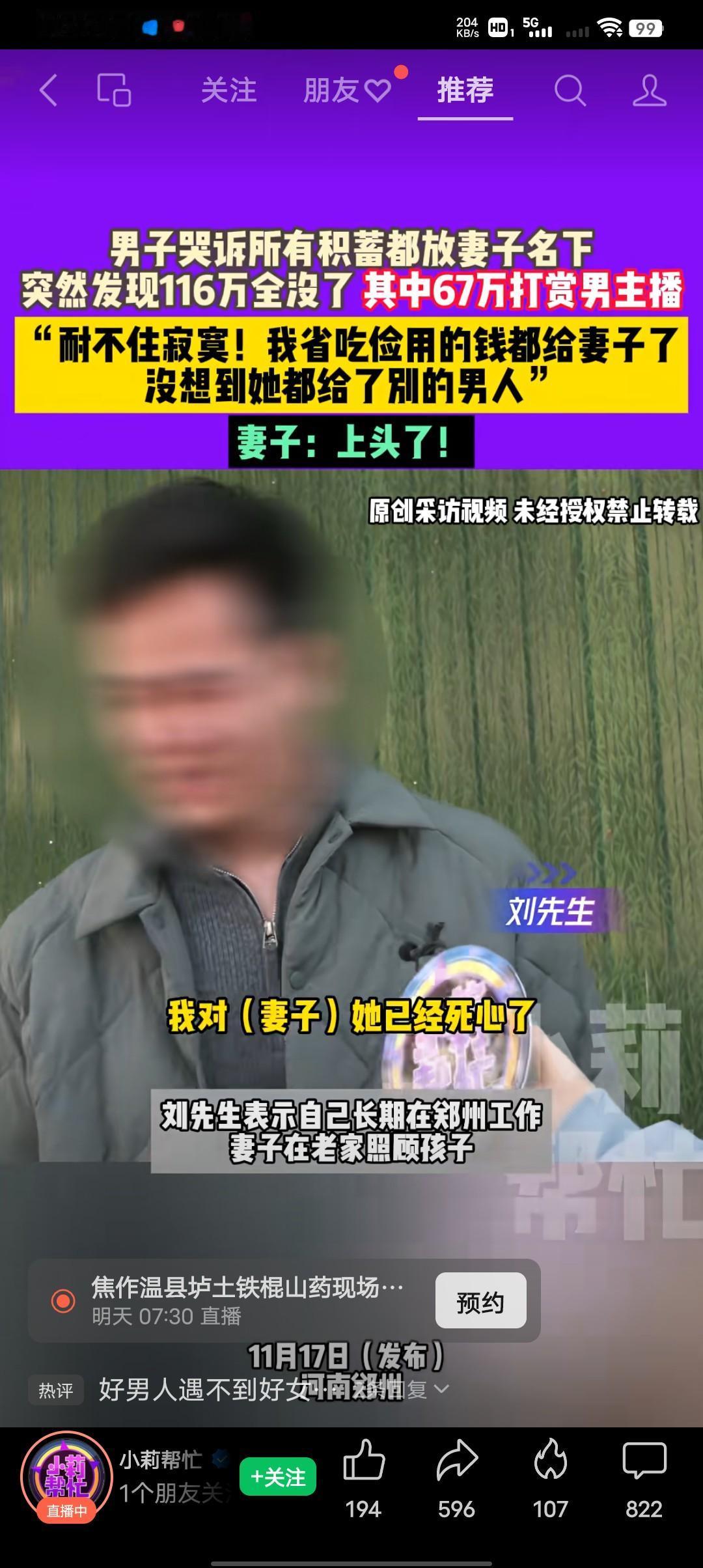 这个世界好像总是不公平,你看好男人永远遇不到好女人,好女人还难找到好男人。 刘先生哭诉:我所有的钱都放在妻子的名下,八年间大概有116万是定期存款,前段时间我想看一下账户余额她支支吾吾的不让看,我就觉得不对劲。在我再三逼问下她才说钱一分都没有了,其中67万给男主播打赏,剩下的钱她也说不清楚,我觉得应该是她耐不住寂寞,她私下交易给了男主播。我们家所有的积蓄都没了,还欠下8万多外债。 我在外面住着300块钱一个月的出租房,夏天漏雨冬天漏风,她在家里夏有空调冬有暖气。我对她死心了不爱了,我只想追回财产,然后再离婚。 媒体记者:你老公把所有的钱都给你了,你当时怎么想的?“我上头了” 看看,这样的女人死一百次都不亏,顾家的男人遇到一个败家不着调的女人,这样的女人死有余辜!对孩子对家庭对老哥没有一点责任心!
