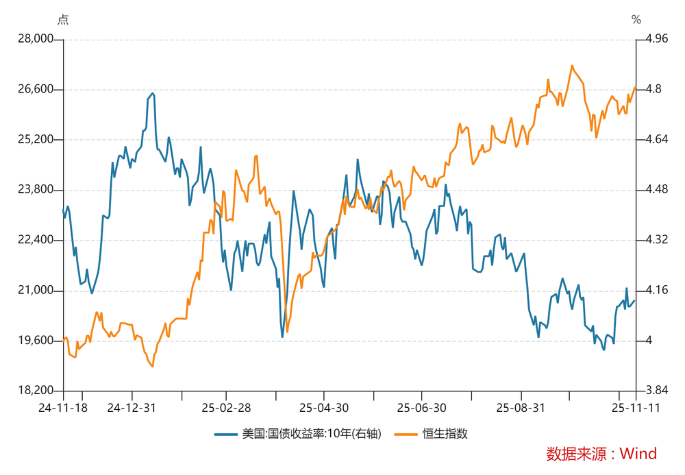 先看全球流动性。港股走势往往与美国10年期国债收益率呈反向关系。
