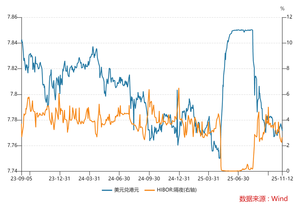 结果就导致银行体系流动性降低,隔夜Hibor大幅上升。2025年9月30日,隔夜Hibor首次超过5%,也是2006年有记录以来季末最大涨幅之一。整个9月中下旬(9月18-30日)隔夜价持续高于3%,并带动1个月Hibor升至3.9%附近,直到11月初高利率趋势才得以结束。