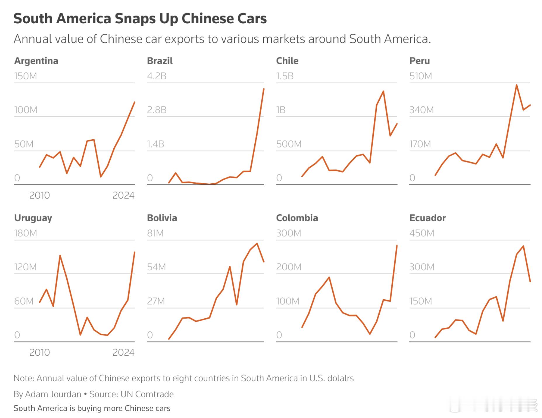 【南美电动汽车销量蓬勃发展——但没有特斯拉】(路透社)——2019年,秘鲁绿色能源企业家路易斯·兹维巴赫(Luis Zwiebach)想买一辆电动汽车,于是他飞越4000英里前往加利福尼亚州试驾特斯拉Model 3轿车。但他没有官方进口商,也找不到绕过秘鲁复杂车辆进口程序的方法。他并未气馁。“有一位先生已经进口了一辆,想把它卖掉,”兹维巴赫说。“所以我去看了看,然后就把它买了下来。”最初,在利马郊外朋友的海滨别墅里给特斯拉充电遇到了困难。“车子充不上电,因为没有接地装置,”他说。“我们找了把叉子,插进土里接地——然后车子就充上电了。”如今,在秘鲁购买电动汽车并不难。特斯拉虽然还没有展厅,但比亚迪、吉利等中国品牌的电动汽车已经大量涌入秘鲁市场。还有长城汽车,其电动汽车在这里的售价约为特斯拉的 60%,以及丰田、起亚、现代等传统汽车制造商。中国汽车制造商正通过传统燃油车和电动汽车双轨并进的方式,扩大在南美洲的市场版图。据秘鲁汽车协会数据显示,截至9月的九个月里,该国共售出135,394辆新车,其中电动汽车占比仍较小,但呈上升趋势。同期混合动力及电动汽车销量达7,256辆,创历史新高,同比增长44%。自去年利马以北的昌凯港启用以来,中国汽车销量持续攀升。这座中国建造的超级港口将跨太平洋运输时间缩短一半,恰逢中国制造商在美国面临日益严峻的市场准入壁垒,在欧洲遭遇更严格的贸易限制之际。生产电动汽车、插电式混合动力车和燃油车的比亚迪(002594.SZ)计划今年底前在利马开设第四家经销店,而奇瑞(9973.HK)和吉利(0175.HK)在秘鲁的经销网点总数已超过十家。"电动汽车在这里表现非常出色,每天售出超过两辆新车,"茨维巴赫在利马表示。他表示,不断增长的需求促使他拓展可再生能源业务,为利马和阿雷基帕的客户(包括房地产开发商、大学和购物中心)提供电动汽车充电桩安装、太阳能电池板和再生能源电梯服务。"有开发商告诉我,只要顶层公寓配有充电桩,他就会买下它,"茨维巴赫说,"于是我们就这样做了。就像给手机充电一样,在家里插上电源即可。"中国汽车制造商正面临国内利润毁灭性的价格战,以及中国工厂生产线不断涌现的新车过剩问题。据JATO Dynamics全球汽车分析师费利佩·穆尼奥斯称,这些过剩车辆大多被运往中东、中亚和拉丁美洲。智利汽车商会主席马丁·布雷西亚尼指出,中国汽车在电动与燃油领域均"开拓了市场空间","中国车企已证明其质量达到全球标准。"今年第一季度,中国品牌在智利乘用车销量占比达29.6%。——中国企业在拉丁美洲崛起国际能源署在《2025全球电动汽车展望》报告中指出,2024年拉丁美洲(含墨西哥和中美洲)电动汽车渗透率翻倍至约4%,并在政府激励政策及中国平价车型涌入的推动下持续增长。最新数据显示,智利9月新车注册量中电动汽车占比达10.6%,巴西8月占比达9.4%,乌拉圭今年三季度占比达28%——据当地汽车协会和咨询公司统计,这些数据均创历史新高。在欧洲和中国,到2025年中期新注册汽车中电动汽车占比将达半数(分别为56%和51%)。日本和美国市场份额相对较低,分别接近2%和10%。即便在经济持续承压且贸易壁垒较高的阿根廷,电动汽车销量也正从低基数持续攀升。中国最大汽车制造商比亚迪于10月首次进军阿根廷市场。该企业已在巴西、哥伦比亚、厄瓜多尔和乌拉圭占据电动汽车销量领先地位。路透社采访的秘鲁、智利、乌拉圭和阿根廷七家经销商指出,中国车企的成功部分源于与当地可信赖进口商合作,推出更实惠且符合区域偏好的车型。乌拉圭市场变化尤为显著:比亚迪已成为该国所有车型销量第三的汽车品牌,仅次于通用汽车旗下雪佛兰和现代汽车。自2023年以来,中国汽车在乌拉圭的市场份额翻倍增长,目前达到22%。在乌拉圭豪华海滨度假胜地埃斯特角城入口处,豪华车经销商贡萨洛·埃尔戈里亚加几年前开始展示比亚迪车型。尽管他仍销售欧美日品牌,但比亚迪如今已主导其销量。"中国品牌先发制人且攻势凌厉,"埃尔戈里亚加在俯瞰曼萨海滩的星际汽车经销店接受路透社采访时表示。他指出,中国品牌已获得市场认可度和规模效应,通过与当地银行合作提供信贷额度和抽奖活动,加之极具竞争力的价格策略——比亚迪纯电动汽车在乌拉圭起售价仅1.9万美元——使其极具吸引力。"传统品牌两辆皮卡的钱,我能买三辆中国皮卡,这差价相当可观。"乌拉圭另一位经销商费德里科·瓜里诺如是说。——新巨型港口为中国打开大陆门户在秘鲁的昌凯港——这个由中国"一带一路"倡议推动建设的巨型港口,成排的白色轿车和堆叠的彩色集装箱取代了昔日迎接周末游客的海边餐馆,这座沉寂的渔村正焕发新生。港口运营商中远海运副经理贡萨洛·里奥斯10月接受路透社采访时表示:"每艘船可运载800至1200辆汽车。"中远预计今年年底前从中国运抵的汽车总量将达1.9万辆。这些汽车抵达后将驶向秘鲁以外的地区。中远海运9月完成首次汽车船转运,向南向智利运送250辆汽车——今年7月中国品牌在智利整体汽车市场份额已达33%。上周另一批混合动力车和电动车正经此转运至智利。里奥斯透露,中远海运还开通了通往厄瓜多尔和哥伦比亚的航线,旨在将秘鲁打造为中国混合动力车、电动车及传统燃油车的区域分销枢纽。中国奇瑞汽车公司表示,其在秘鲁电动汽车