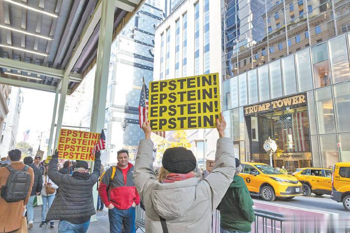 16日,示威者在纽约特朗普大厦外和平抗议,手持标语和横幅,要求“法治而非报复”“公开爱泼斯坦案文件”。(ICphoto)