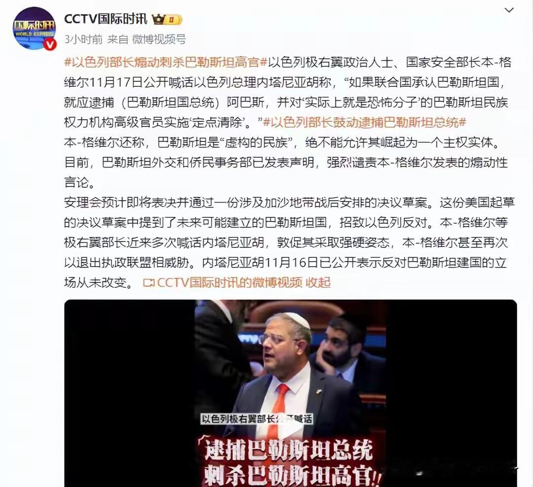 胆大包天?口出狂言?! 就在刚刚,以色列国家安全部长煽动逮捕巴勒斯坦国总统阿巴斯,并“定点清除”巴勒斯坦高官! 这就是以色列极右翼势力的极端想法,现在连美国都不放在眼里了?美国可是在推动加沙停火,阿巴斯政府可是关键一环,你把他们清除了,还停个毛线?不怕哈马斯掌管巴勒斯坦吗?[捂脸] 再说了,国际社会对巴勒斯坦的“两国方案”进程推动的不错,得到了大部分国家的支持,以色列安全部长不是在跟国际社会唱反调吗?严重扼杀“两国方案”! 此前,内塔尼亚胡也明确反对巴勒斯坦建国。 可见,以色列在巴勒斯坦问题上是尿性未改,同时,也是在转移国内矛盾! 接下来,势必陷入外交孤立!内塔尼亚胡政府早晚也有被清算的一天! 对此,大家怎么看?