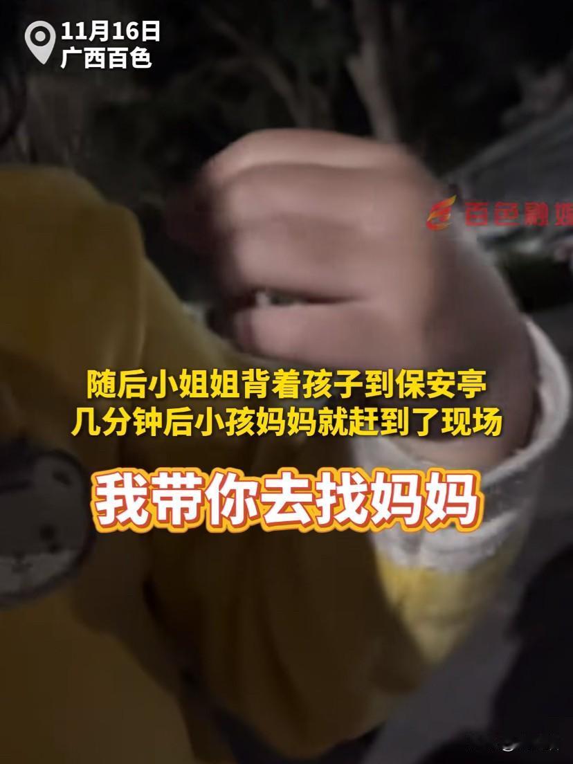 广西百色,女子凌晨三点突然听到窗外传来小孩子的哭声。女子带着疑惑走到窗户边上看,看到一个小孩子在路上一边哭一边找妈妈。 女子赶忙披上一件外套,随即开门出去。小孩子已经走远,但她的哭声依然响彻在漆黑的夜空。女子一边跑向孩子一边温柔的呼唤他。 孩子听到女子的叫唤停下脚步,看向女子。女子在她跟前蹲下,孩子对她:妈妈不见了。女子温柔的把孩子搂到身边,问她从哪里来?孩子伸出手往前指。 女子顺着孩子的手往前看,前面虽然有房子,但她不知道孩子到底住在哪一栋。她安慰孩子不哭,还把孩子背到保安室,向保安说明情况。 或许是觉得女子会帮自己找到妈妈,孩子在女子的背上止住了哭泣,在保安室里,她也没有哭。 女子和保安也不知道孩子到底是哪家?他们哄着孩子,心里想家长发现孩子不见后,应该会出来找的。 好在,没过几分钟。孩子的妈妈就找到了保安室,孩子看到妈妈,哇的一声哭了。看到孩子后,妈妈紧绷的神经终于放松了。 她向女子和保安致谢。她说:孩子奶奶半夜生病,孩子爸爸出差不在家。我把奶奶送去医院,我看孩子平时都是一觉睡到天亮。 我就没有叫醒她,而且家里有监控,出门后我一直在手机里看着监控。后来在医院忙其他的事情,有五分钟没看监控。 再看时,不见孩子踪影,叫她名字也没有听到回应,我就赶紧跑回来了。 真的太感谢你们了。要不是你出来看孩子,真不敢想后面的事。 看到孩子已经回到妈妈的怀里,女子也放心了。她没有想着自己晚睡还做了一个好事。