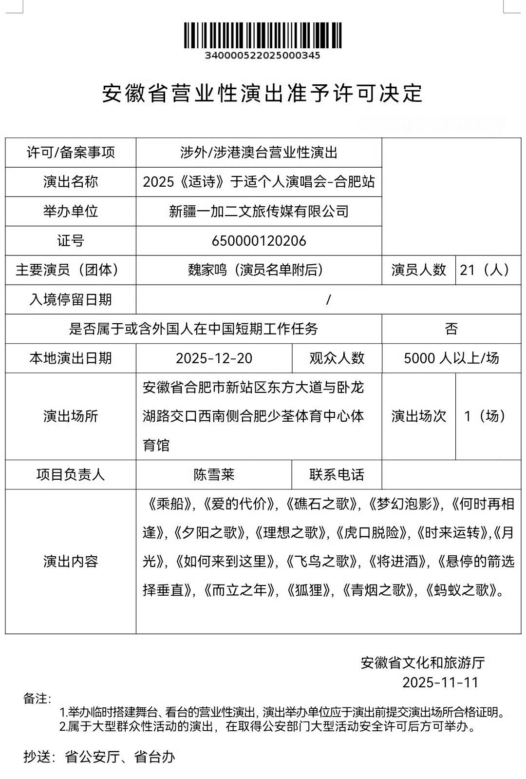 于适合肥演唱会下证了,18首歌🎶 演出时间:12.20⏰