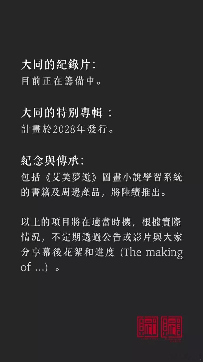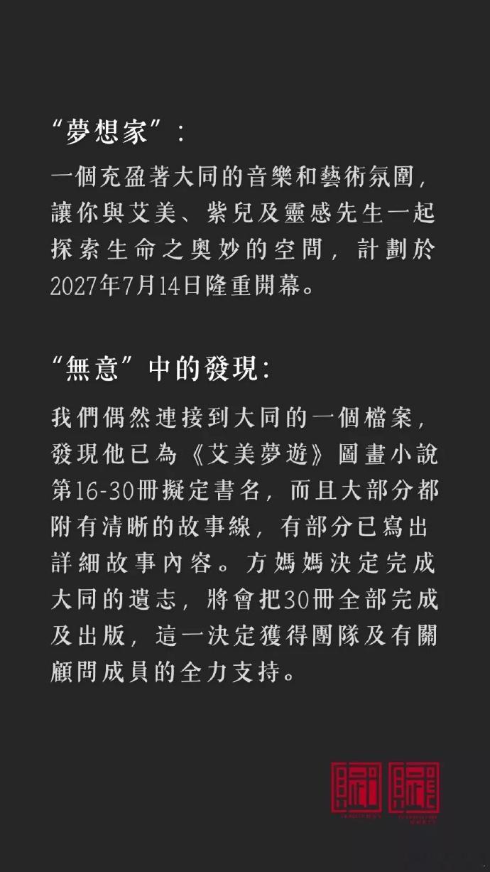 18日, 公布方大同出道20周年计划,“梦想家”2027年开幕、方妈妈继续完成大同留下的《艾美梦游》图画小说完成并出版、大同纪录片筹备中、大同特别专辑2028年发行等。大同不曾离开