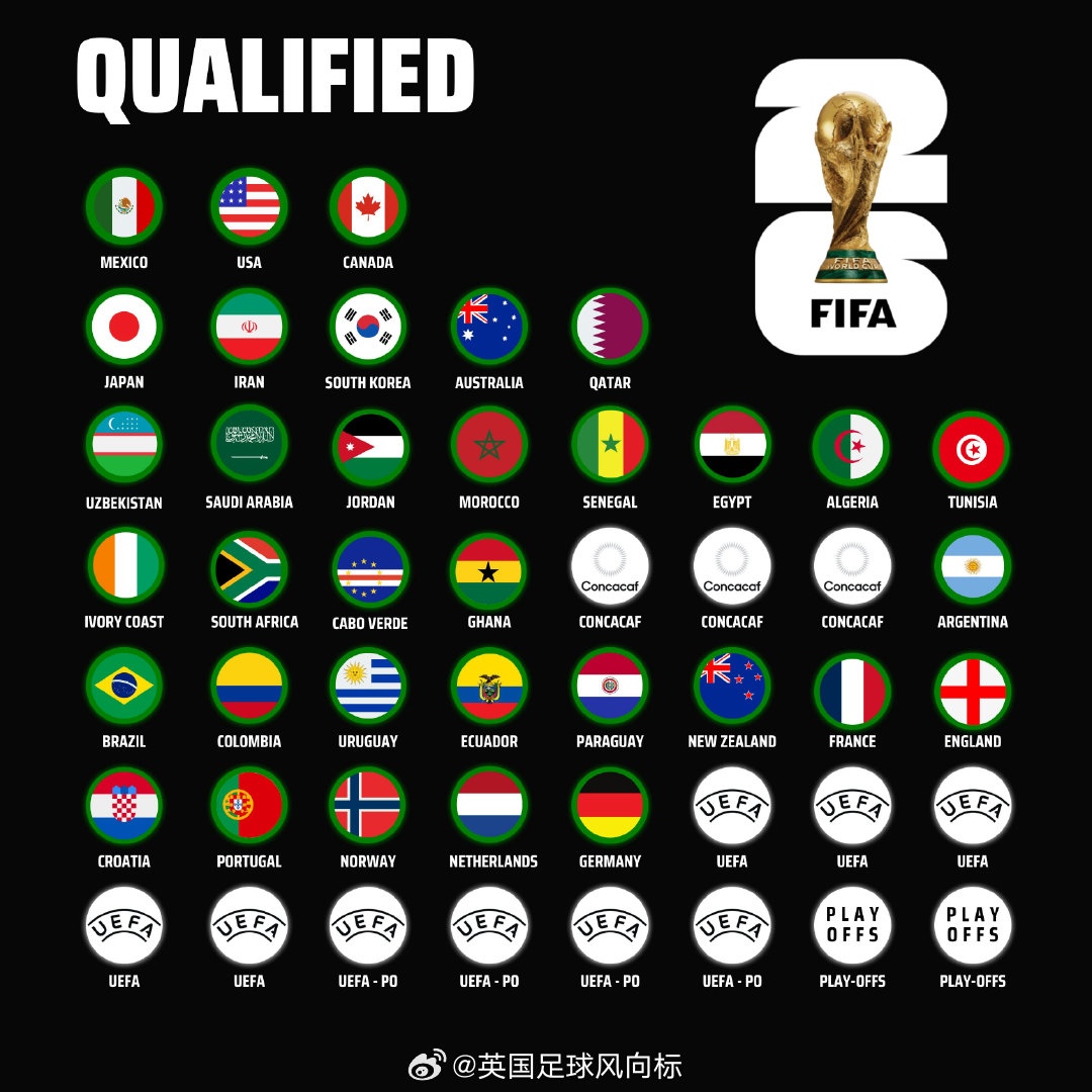 东道主:美国、加拿大、墨西哥欧 洲:英格兰、法国、克罗地亚、葡萄牙、挪威、德国、荷兰亚 洲:日本、伊朗、乌兹别克斯坦、韩国、约旦、澳大利亚、沙特、卡塔尔大洋洲:新西兰南美洲:阿根廷、巴西、厄瓜多尔、乌拉圭、哥伦比亚、巴拉圭非 洲:摩洛哥、突尼斯、埃及、阿尔及利亚、加纳、佛得角、南非、塞内加尔、科特迪瓦