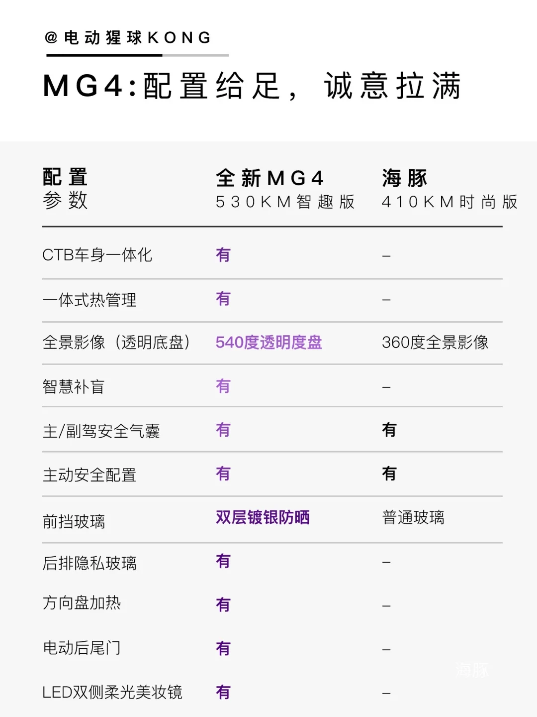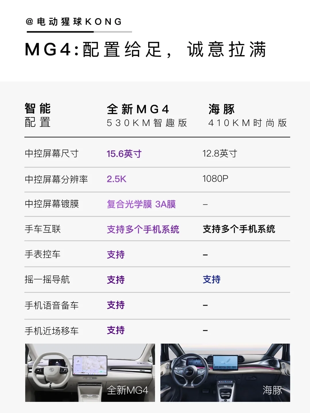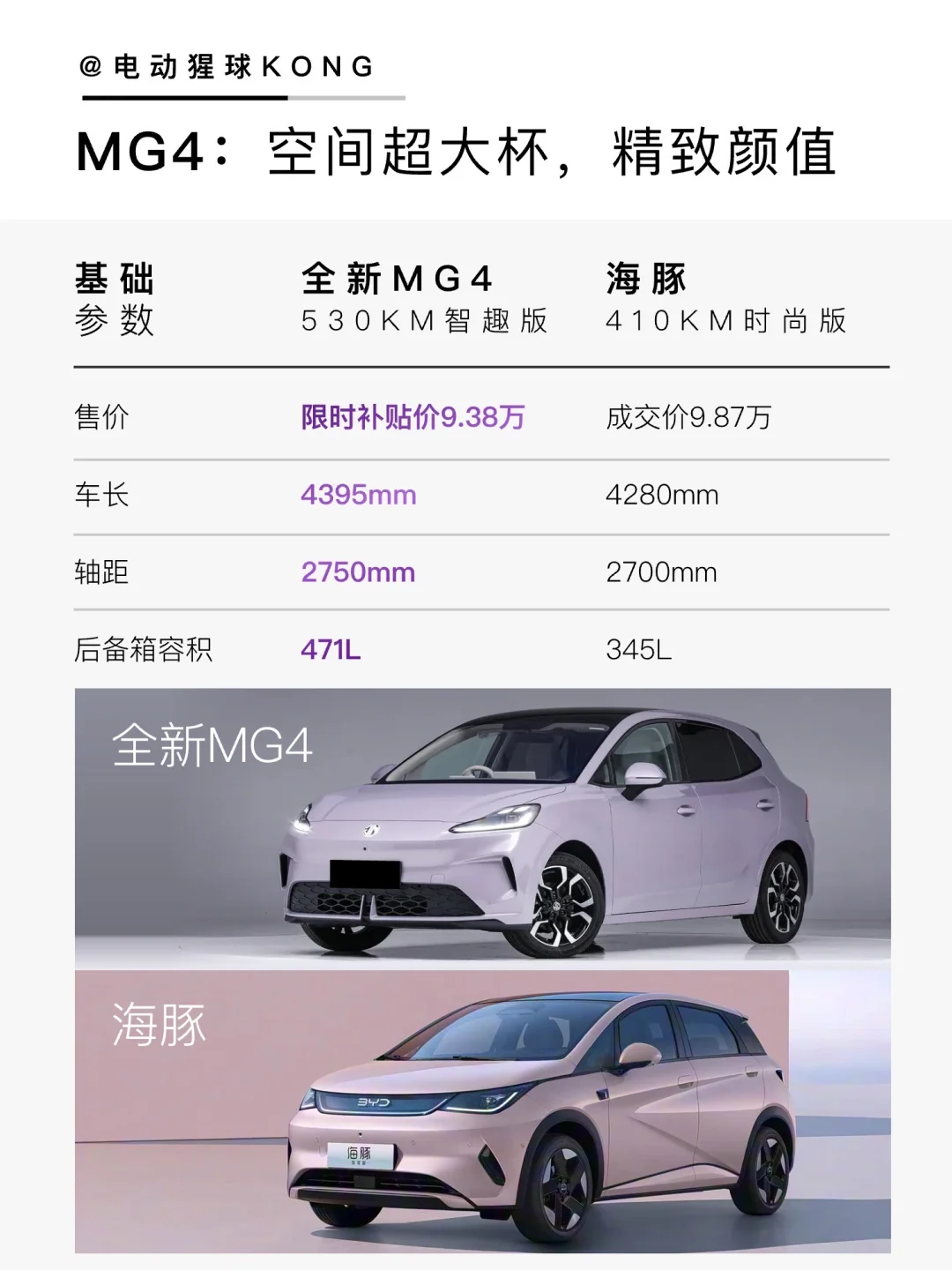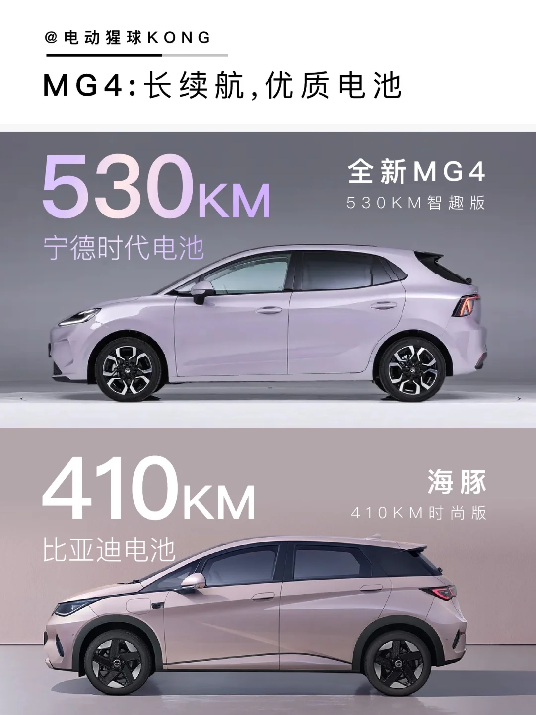 💡总的看下来,海豚是稳妥的选择,但全新MG4在尺寸、续航、智能化都小卷了一下,并且今年交付的530km智趣版全部升级宁德电池,基本无短板,值得推荐~