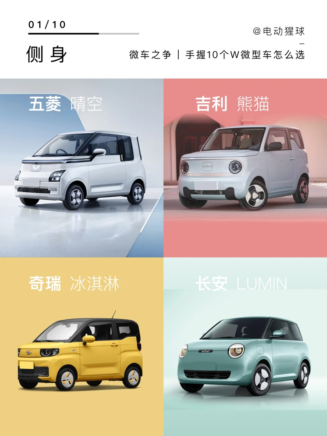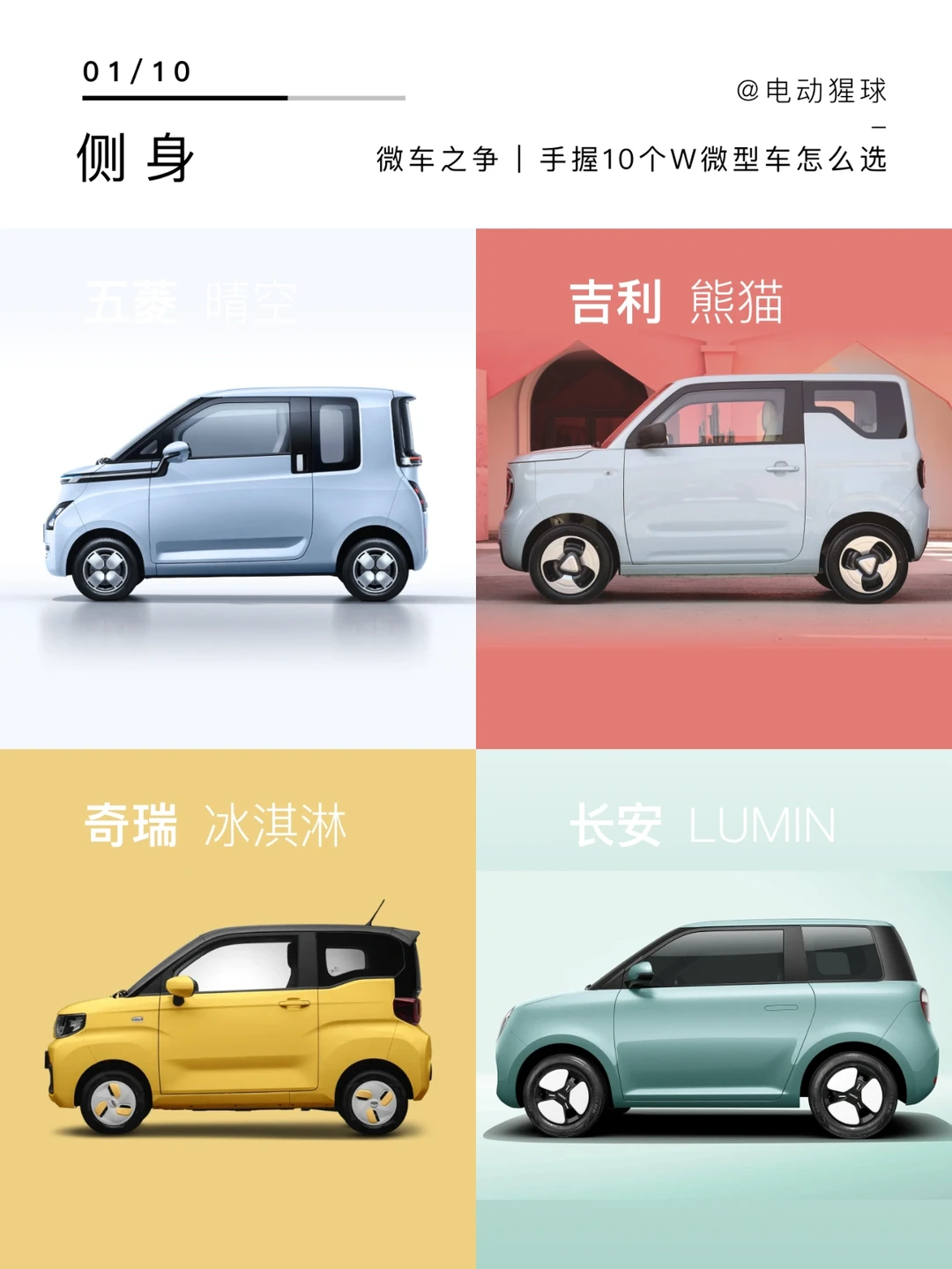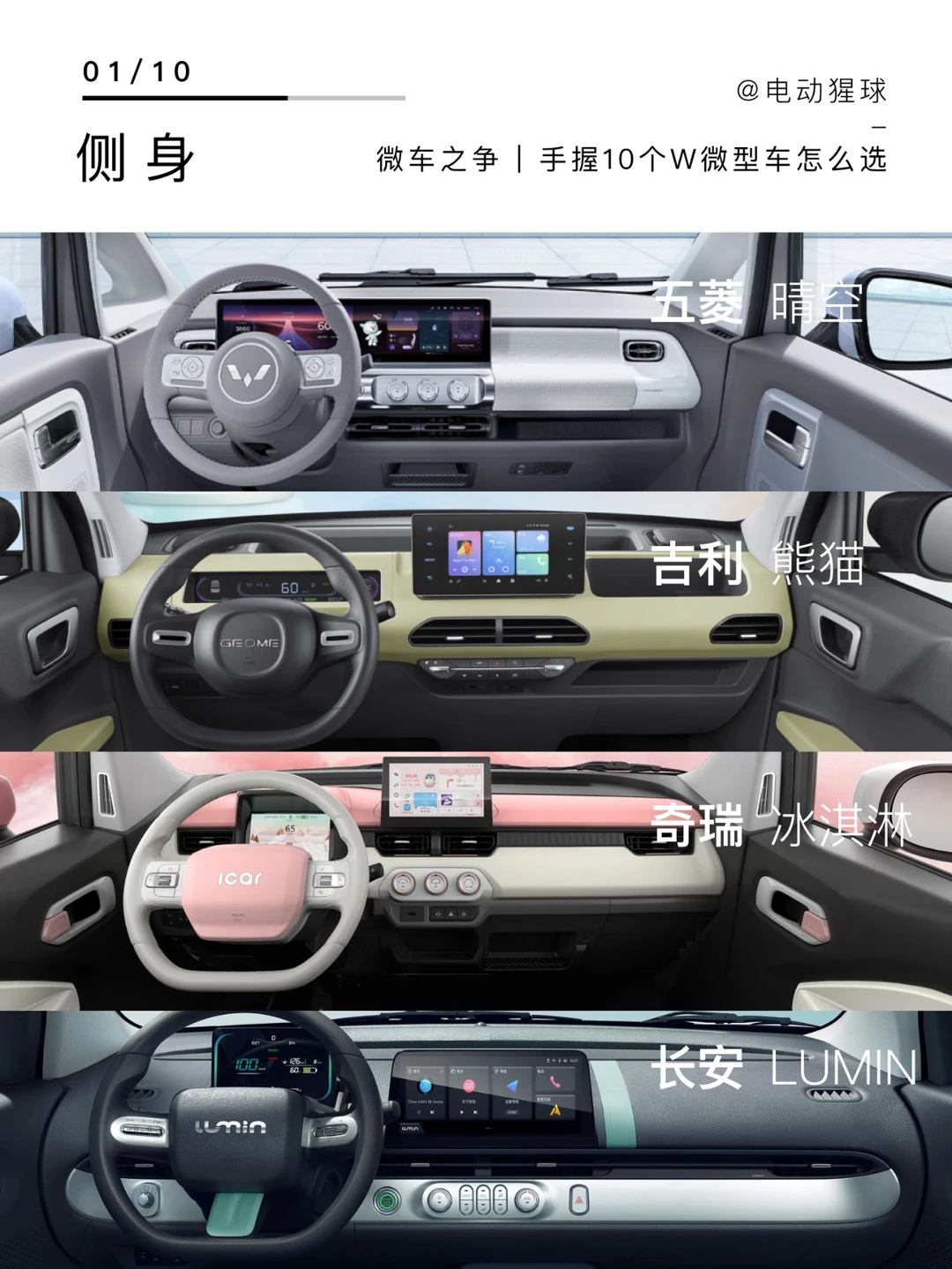 五菱air晴空EV 综合:4 外观:5 内饰:4 品牌:5 价格:2 吉利熊猫 综合:3.25 外观:3 内饰:3 品牌:4 价格:3 奇瑞冰淇淋 综合:3 外观:3 内饰:2 品牌:3 价格:4 长安LUMIN 综合:3.75 外观:4 内饰:3 品牌:4 价格:4 手握10个W,你怎么选? 不做韭菜,看电动猩球