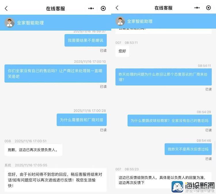 【:对方发笑称在亏钱,只退10元】11月17日,消费者陆晶(化名)反映,她于11月15日上午在全家便利店苏州大学东校区店购买了一个全麦蜜汁鸡排三明治。食用时,她刚吃一口便感觉味道异常,随即吐了出来,随后发现三明治中有一只绿色虫子。陆晶告诉记者,11月15日晚,她通过全家微会员小程序人工客服进行投诉,并按客服要求提供了支付信息、实物照片及商品信息图等资料。客服确认收到信息后表示,将有负责人与她电话联系。11月16日,陆晶接到一位“负责人”的来电。据陆晶描述,该“负责人”在电话中声称自己是三明治生产商,通话过程中,对方不断发笑,并表示自己“一直在亏钱”,仅愿意退还10元作为处理方式。在陆晶告知将进行录音后,对方反指她“威胁自己”。挂断电话后,陆晶立即通过全家微会员小程序向客服反馈该“负责人”态度恶劣的问题,客服回复称已转达负责人,后续会再次联系。然而,第二次来电的仍是同一人,对方依旧在电话中发笑,并声称自己代表全家客服。11月17日,陆晶再次联系全家客服,对方表示将更换专员对接处理。截至目前,全家方面仍未与陆晶取得联系。17日下午,记者致电该全家便利店,店家表示正在积极处理此事,但因消费者未直接与其联系,需先了解具体情况。记者随后又致电全家官方客服及三明治生产商大联洋食品(无锡)有限公司,双方均回应称目前对事件不知情,已向上级反馈,后续将予以回复。截至发稿前,记者尚未收到回复。(海报新闻)